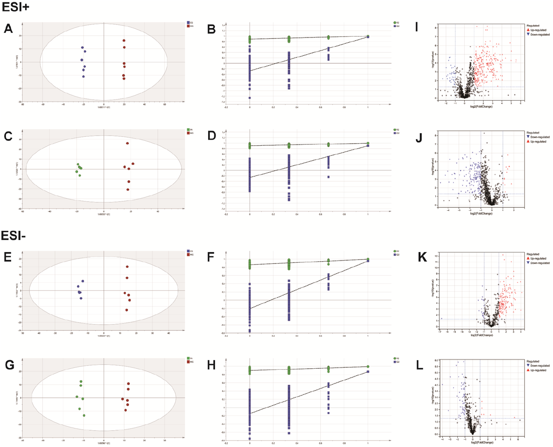 FA intervention on hyperlipidemia mice. Positive ESI model: Score plot of OPLS-DA between MG and CG (A). The result of cross-validation of OPLS-DA model between MG and CG (B). Score plot of OPLS-DA between FA and MG (C). The result of cross-validation of OPLS-DA model between FA and MG (D). Negative ESI model: Score plot of OPLS-DA between MG and CG (E). The result of cross-validation of OPLS-DA model between MG and CG (F). Score plot of OPLS-DA between FA and MG (G). The result of cross-validation of OPLS-DA model between FA and MG (H). Positive ESI model: The volcano plot of the differential metabolites was screened in the MG and CG (I). The volcano plot of the differential metabolites was screened in the FA and MG (J). Negative ESI model: The volcano plot of the differential metabolites was screened in the MG and CG (K). The volcano plot of the differential metabolites was screened in the FA and MG (L).