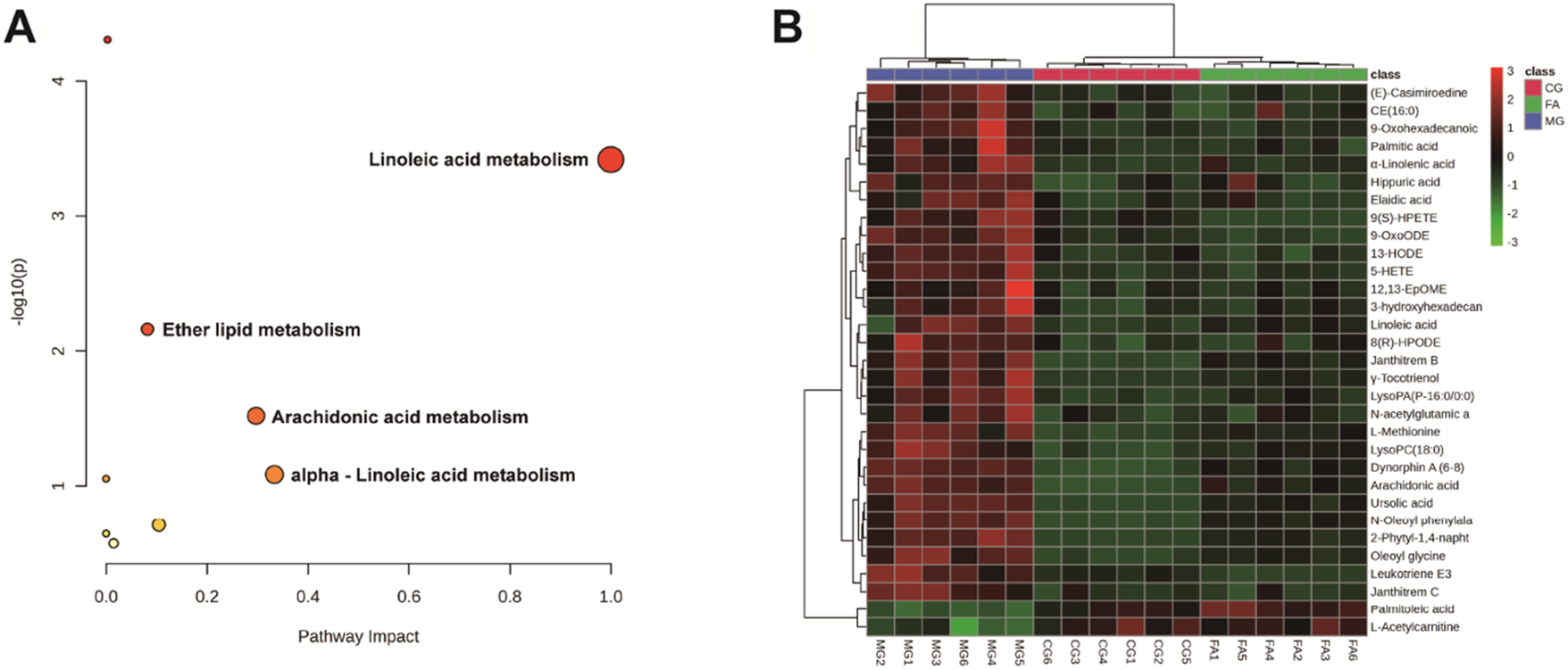 Multivariate statistical analysis was conducted using SIMCA 14.1 software with unsupervised principal component analysis (PCA) and orthogonal partial least discriminant analysis (OPLS-DA) models, and the results of OPLS-DA needed to be further confirmed by 200 times permutation evaluations. Statistical analyses were then performed using the online tool Metaboanalyst 6.0 for univariate student t-test and finally for difference multiple (FC value) analysis. The metabolites with significantly different (Variable important in projection (VIP) > 1, p < 0.05, Fold change (FC) < 0.8, or FC > 1.2) between MG and CG and between FA and MG were screened for preliminary identification and analysis. Further analysis of these metabolites was performed to screen for significant differences between FA and MG metabolites. It showed a recovery trend compared with CG, which was screened as the differential metabolite for treating hyperlipidemia. Potential biomarkers were characterized according to the METLIN and Human Metabolome databases, and pathways of differential metabolites were analyzed using the online software MetaboAnalyst 6.0 (http://www.metaboanalyst.ca/) (Pang et al., 2024).