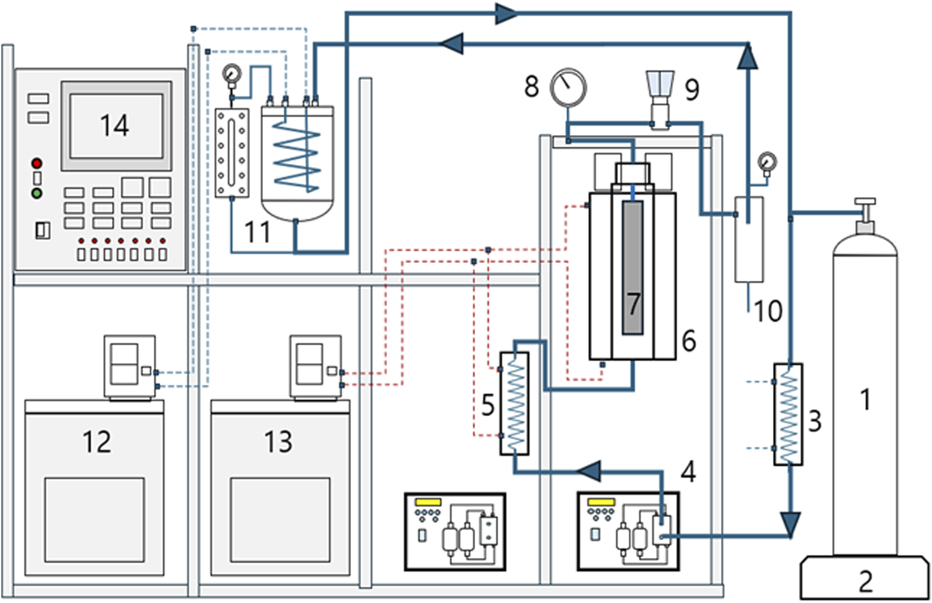 A schematic diagram of the supercritical extraction system: 1, CO2 cylinder; 2, Balance; 3, Precooler; 4, Plunger pump; 5, Preheater; 6, Extractor vessel; 7, Inner basket; 8, Pressure gauge; 9, Back Pressure Regulator; 10, Separator; 11, CO2 storage with level gauge; 12, Cooling Bath Circulator; 13, Heating Bath Circulator; 14, Process Control System.