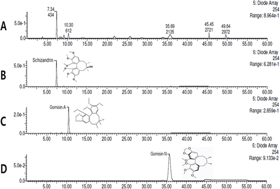 To determine concentrations of schizandrin, gomisin A, and gomisin N in SOSC, HPLC analysis was performed. The HPLC chromatogram of SOSC revealed a retention time (tR) of 7.34 min for schizandrin, 10.30 min for gomisin A, and 35.69 min for gomisin N when compared to a reference standard peak (Figure 2). To quantify concentrations of the three compounds, calibration curves for each compound were established using serially diluted standard solutions ranging from 1,000 to 62.5 μg/mL. Linear regression equations for these compounds exhibited high coefficients (R2 > 0.9990) of determination: Y = 447.17X - 5,340.1 (R2 = 0.9995) for schizandrin, Y = 245.81X - 592.96 (R2 = 0.9998) for gomisin A, and Y = 383.69X - 4,084.7 (R2 = 0.9994) for gomisin N. Finally, concentrations of schizandrin, gomisin A, and gomisin N in SOSC were determined to be 54.71 ± 0.01 mg/g, 25.13 ± 0.01 mg/g, and 36.46 ± 0.01 mg/g, respectively (Figure 2).