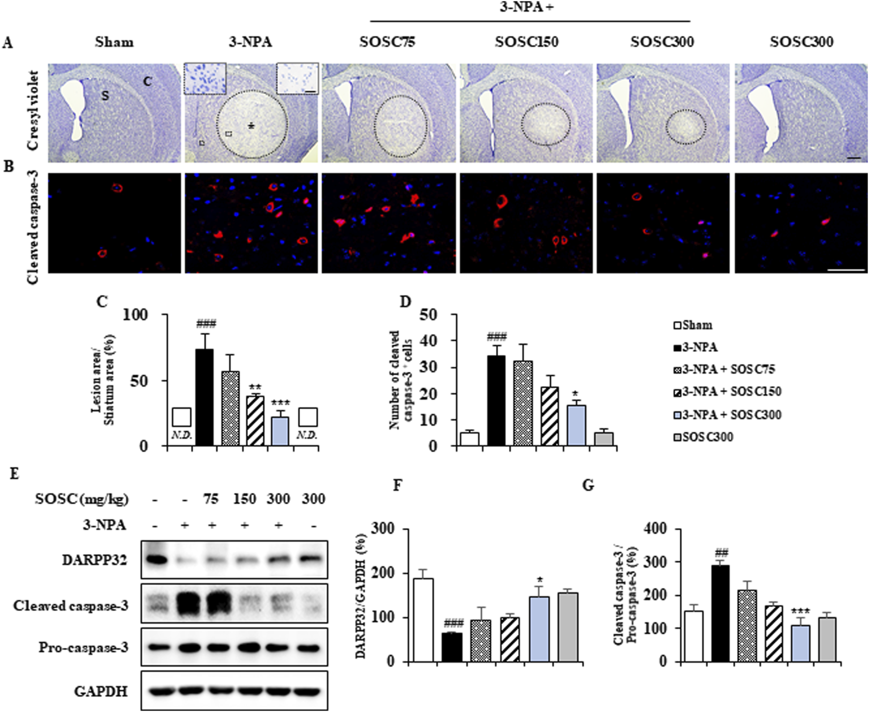 3-NPA produces striatal neurodegeneration and some neurological disturbances known to be characteristics of Huntington’s disease in rodents and primates (Brouillet et al., 2005; Tunez et al., 2010; Upadhayay et al., 2023). Thus, we explored whether SOSC could ameliorate striatal neurodegeneration by 3-NPA-intoxication. Twenty-four hours after the last (4th) 3-NPA-intoxication, coronal cryo-sections of brain (n = 5 group) including the striatum were stained with cresyl violet dye. Figure 4A shows representative striatal images from sham, 3-NPA, 3-NPA + SOSC (75, 150, and 300 mg/kg/day), and SOSC alone (300 mg/kg/day) groups. The 3-NPA-treated group exhibited visible bilateral striatal lesions (pale areas surrounded by dotted line), whereas treatment with SOSC resulted in smaller lesions in a dose-dependent manner (Figure 4A). Results of quantification revealed that the ratio of mean lesion area to the entire striatum was 73.2% in the 3-NPA group, while this ratio was reduced by SOSC in dose-dependent manner to 56.4%, 37.6%, and 21.8% in the group administered with SOSC at 75, 15, and 300 mg/kg/day, respectively (Figure 4C). Based on results from cresyl violet staining (Figures 4A, C), to further compare levels of neurodegeneration, striatal lysates of all groups were subjected to Western blot assay with DARPP32 antiserum (a marker for medium spiny neurons of the striatum) (Ivkovic et al., 1997) (Figures 4B, E, F). Protein expression of DARPP32 was clearly decreased to 62.6 ± 3.3 in the 3-NPA group compared with the Sham group (188.6 ± 19.4), whereas its expression was significantly restored to 147.5 ± 23.4 in the 300 mg/kg/day SOSC-administered 3-NPA group (Figures 4E, F). To test whether the anti-neurodegenerative effect of SOSC might be related to apoptosis, we investigated the immunoreactive level of cleaved caspase-3 (a representative apoptosis marker) in the striatum by immunofluorescence staining (Figures 4B–D). Cleaved caspase-3 immunoreactivity was increased in the 3-NPA group than that in the sham group. However, its immunoreactivity was decreased by SOSC (at 75, 15, and 300 mg/kg/day) in a dose-dependent manner (Figures 4B, D). The expression pattern of cleaved caspase-3 was similar to that of cleaved caspase-3 based on Western blot (Figures 4E, G). Since administration with 300 mg/kg/day of SOSC was the most effects on behavioral dysfunction (Figure 3B), survival rate (Figure 3C), and striatal neurodegeneration (Figures 4A–G) following 3-NPA-intoxication, this dose of SOSC was used in further studies.