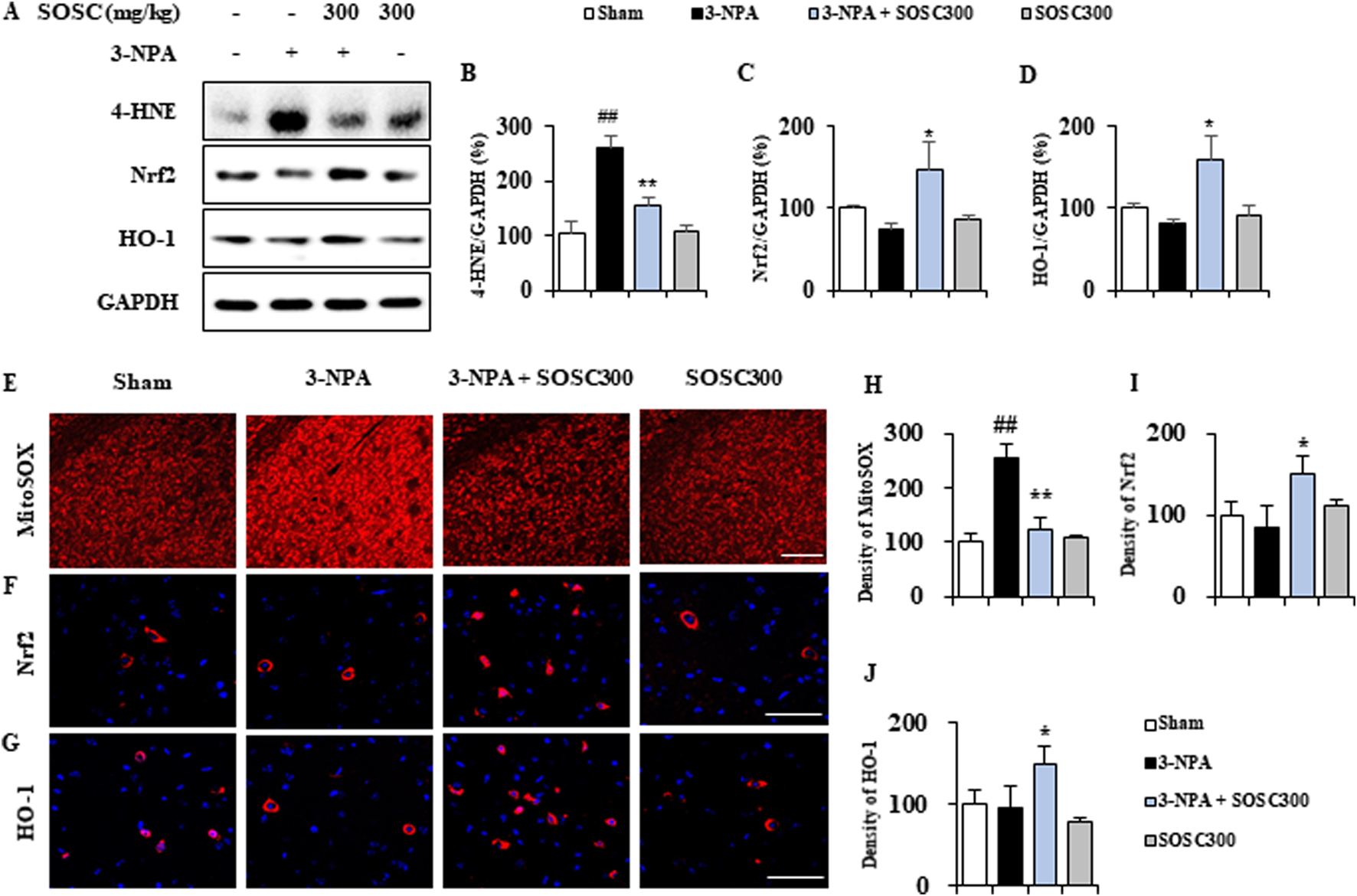 SOSC inhibits ROS and stimulates antioxidant signaling pathways (Nrf2-HO-1) in the striatum after 3-NPA intoxication. (A–D) Twelve hours after the last (4th) dose of 3-NPA intoxication, striatal lysates (n = 5 per group) from sham, 3-NPA, 3-NPA + SOSC (300 mg/kg/day), and SOSC (300 mg/kg/day) groups were subjected to Western blot assay (A) and quantified (B–D). SOSC decreased the protein expression of 4-HNE (A and B) but increased the protein expression levels of Nrf2 (A, C) and HO-1 (A, D) signaling pathways. (E–G) Cryo-striatal sections (n = 5 per brain) from all groups (5 brains per group) were subjected to MitoSOX staining (E) and immunofluorescence staining using Nrf2 and HO-1 antibodies (F, G). Scale bar = 20 μm. The intensities of the signals in the striatum were measured (H–J). Data are expressed as mean ± SEM (one-way ANOVA with post hoc; #p < 0.05, ##p < 0.01, and ###p < 0.001 vs. Sham group; *p < 0.05, **p < 0.01, and *p < 0.001 vs. 3-NPA group). 3-NPA, 3-nitropropionic acid; 4-HNE, 4-hydroxynonenal; Nrf2, nuclear factor erythroid 2-related factor 2; HO-1, heme oxygenase 1; GAPDH, glyceraldehyde 3-phosphate dehydrogenase; SOSC, seed oil of Schisandra chinensis.
