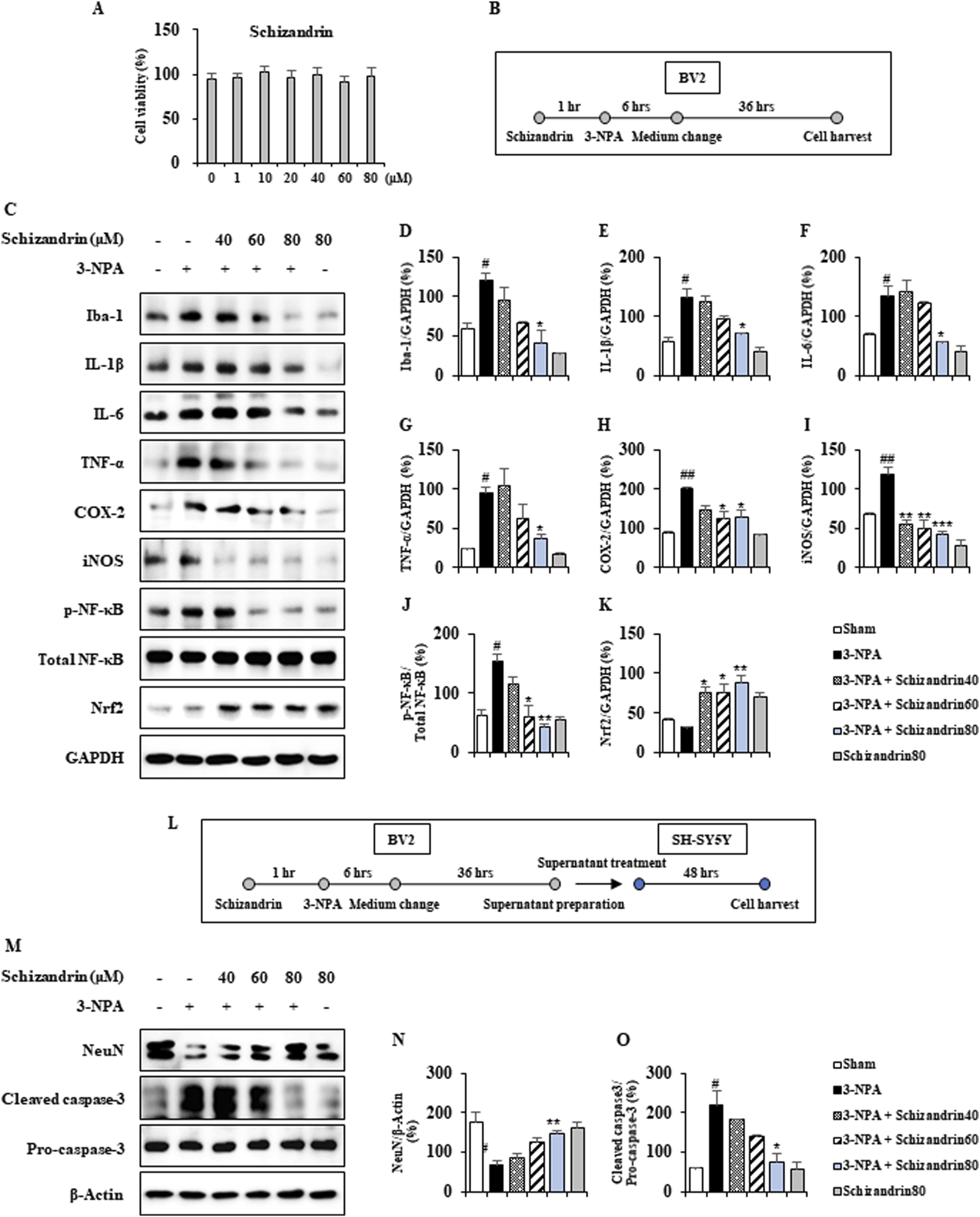 Microglial conditioned medium prevents apoptosis (neuronal cell death) in 3-NPA-induced SH-SY5Y cells. (A) The MTT assay was used to measure the cytotoxicity (loss of viable cells) of SOSC in BV2 cells. (C–K) Cultured BV2 cells were pretreated with schizandrin (40, 60, and 80 μM) 1 h before 3-NPA stimulation. These cells were subjected to Western blot analysis using antibodies against Iba-1, IL-1β, IL-6, TNF-α, COX-2, iNOS, NF-κB, and Nrf2. Their bands were quantified relative to GAPDH levels (B–D). (L–O) Cultured SH-SY5Y cells were treated with CM-Sch-3-NPA or CM-3-NPA 1 h before 3-NPA stimulation. These cells were then subjected to Western blot analysis using NeuN and cleaved caspase-3 antibodies (E and F). Bands were quantified relative to GAPDH levels. Data are expressed as mean ± SEM (one-way ANOVA with post hoc; #p < 0.05, ##p < 0.01, and ###p < 0.001 vs. Sham group; *p < 0.05, **p < 0.01, and ***p < 0.001 vs. 3-NPA group). 3-NPA, 3-nitropropionic acid; Iba-1, ionized calcium-binding adapter molecule 1; NF-κB, nuclear factor-kappa B; Nrf2, nuclear factor erythroid 2-related factor 2; GAPDH, glyceraldehyde 3-phosphate dehydrogenase; SOSC, seed oil of Schisandra chinensis.