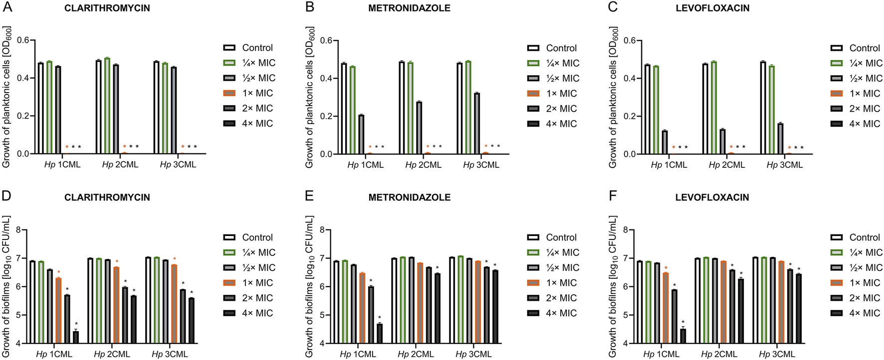 The effect of different antibiotic concentrations on the survival of planktonic and biofilm forms of H. pylori. Graphs showing the viability of planktonic forms (A–C) and biofilm forms (D–F) of the tested H. pylori strains exposed to a gradient of antibiotic concentrations (¼× MIC – 4× MIC): clarithromycin (A, D), metronidazole (B, E) and levofloxacin (C, F). Bacteria were cultured in 12-well microtiter plates for 3 days at 37°C, microaerophilic conditions and with shaking (100 rpm and 50 rpm for planktonic and biofilm cells, respectively). The viability of planktonic cells was measured using spectrophotometric measurement (OD600), and the viability of biofilm cells was measured by sowing biofilm scraped from the walls of microplates and reading CFU/mL after a 3-day culture on Columbia agar at 37°C and microaerophilic conditions. In all cases, values are from three biological replicates with three technical replicates (n = 9); the results are the mean ± standard deviations. Statistical analysis was performed using the Kruskal–Wallis test with Holm correction. p < 0.05 was considered statistically significant.