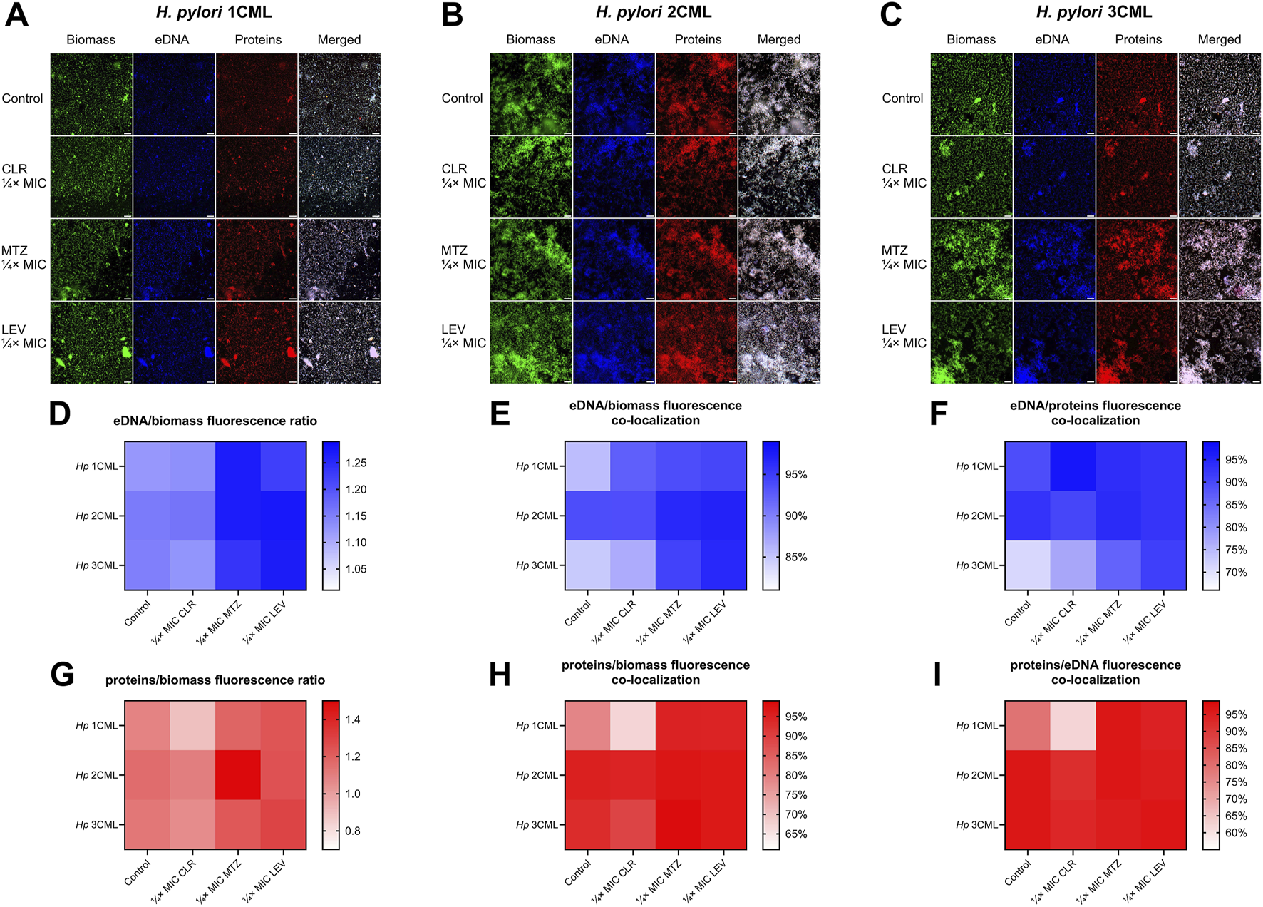 The effect of antibiotics on the biochemical properties of the developing biofilm of H. pylori. Schematic panels illustrating representative images of 3-day-old biofilms of H. pylori 1CML (A), 2CML (B), and 3CML (C) developed under constant exposure to ¼× MIC of antibiotics (clarithromycin [CLR], metronidazole [MTZ] and levofloxacin [LEV]). The development of biofilms took place in 12-well microtiter plates for 3 days at 37°C, microaerophilic conditions and shaking at 50 rpm. Cell biomass, eDNA and proteins were fluorescently stained with SYTO9, DAPI and SYPRO RUBY, respectively. Scale bars = 40 µm. Using the Bioflux Montage software, the fluorescence intensity of biofilm components (D, G) and the degree of their co-localization (E–I) was calculated and the obtained data were presented as heat maps. Data for eDNA are shown in points (D-F), while data for proteins are illustrated in points (G–I). In all cases, values are from three biological replicates with five technical replicates (n = 15).