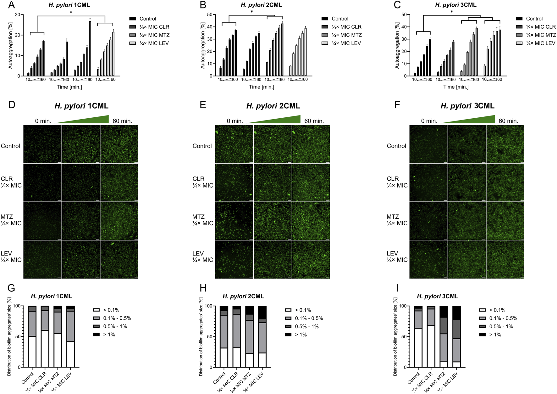 The effect of antibiotics on the autoaggregation of H. pylori. Graphs and panels of representative photos showing the speed of autoaggregation of H. pylori 1CML (A, D), 2CML (B, E) and 3CML (C, F) during 1-h exposure to ¼× MIC of antibiotics (clarithromycin [CLR], metronidazole [MTZ] and levofloxacin [LEV]). The autoaggregation experiments took place in 12-well microtiter plates at 37°C and microaerophilic conditions. The speed of autoaggregation was interpreted as the rate of bacterial coverage of the observation field and was calculated using the ImageJ software. The speed of autoaggregation was each time normalized in relation to the initial amount of autoaggregation (0 min), hence the starting point was not included in graphs (A–C) and was considered as 0%. For better visualization of the cells, the bacteria were treated with 1 μL/mL of the non-toxic fluorescent dye from the CellTrace CFSE Cell Proliferation Kit. Scale bars for photographic panels (D–F) are equal to 40 µm. Using the ImageJ software, additional information was obtained about the size distribution of aggregates, which was presented in (G–I) charts. In all cases, values are from three biological replicates with three technical replicates (n = 9); the results are the mean ± standard deviations. Statistical analysis was performed using the Kruskal–Wallis test with Holm correction. p < 0.05 was considered statistically significant.