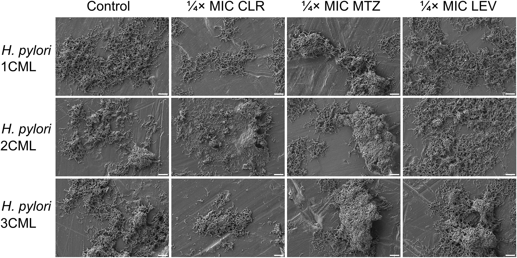 The effect of antibiotics on the ultrastructure of the developing biofilm of H. pylori. Panel of representative photos showing biofilms of H. pylori 1CML, 2CML and 3CML created during autoaggregation experiments and 1-h exposure of bacteria to ¼× MIC of antibiotics (clarithromycin [CLR], metronidazole [MTZ] and levofloxacin [LEV]). The development of biofilms took place in 12-well microtiter plates at 37°C and microaerophilic conditions. Scale bars = 10 µm.