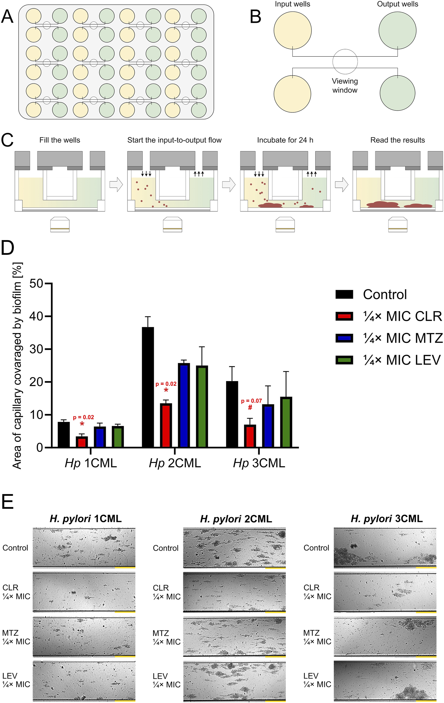 The effect of antibiotics on the biofilm development of H. pylori in microfluidic conditions. Cartoon images showing the microfluidic plate (A) and a close-up of its fragment containing the inlet and outlet wells connected by microcapillaries (B). Point (C) presents the scheme of the experiment, including microfluidic culture of H. pylori strains. In point (D, E), a graph showing the degree of development of biofilms of H. pylori strains and a panel of representative photos showing the growth of H. pylori biofilms in microcapillaries are presented, respectively. Bacteria were cultured in 48-well microfluidic plates for 1 day at 37°C, microaerophilic conditions and medium flow of 0.1 dyne/cm2 and were exposed to ¼× MIC of antibiotics (clarithromycin [CLR], metronidazole [MTZ] and levofloxacin [LEV]). The degree of capillary coverage was interpreted as the amount of biofilm formed, which was calculated using the Bioflux Montage software. Yellow scale bars for photographic panels (E) are equal to 20 µm. In all cases, values are from three biological replicates (n = 3); the results are the mean ± standard deviations. Statistical analysis was performed using the Kruskal–Wallis test with Holm correction. p < 0.05 was considered statistically significant (*), while p > 0.05 but < 0.1 was considered statistical tendency (#).