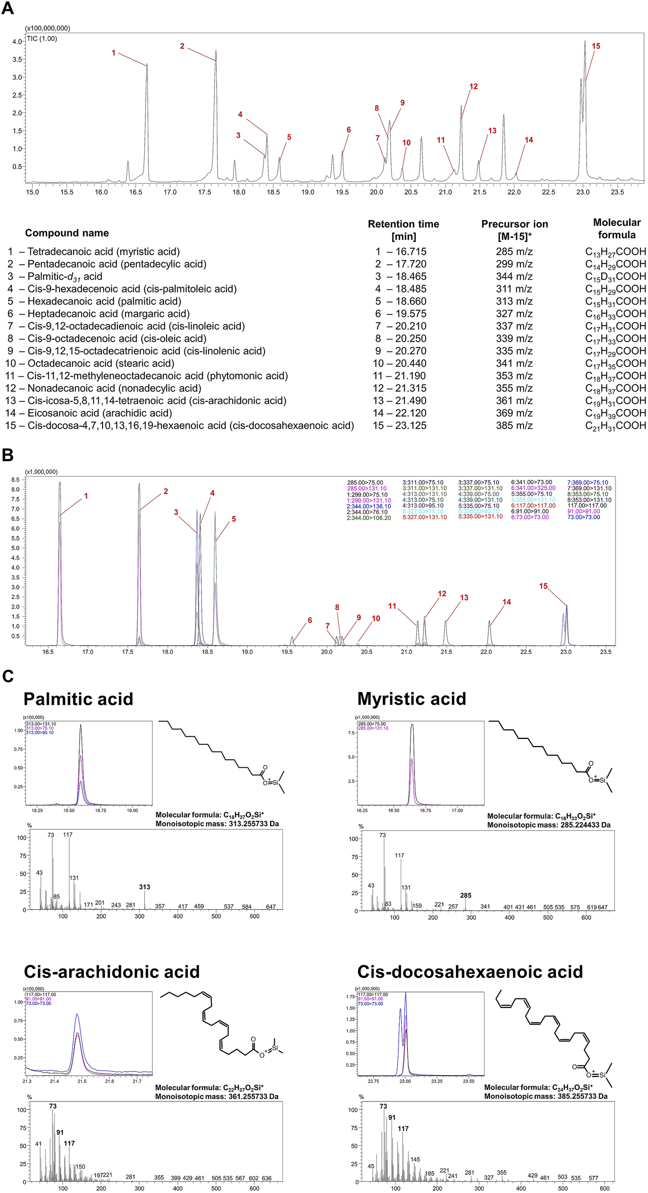 Using untargeted analysis can pose many difficulties in identifying lipids with similar chemical structures whose mass spectra are very similar to each other, as can be seen in Figure 7C, which depicts the mass spectra of palmitic acid, myristic acid, cis-arachidonic acid and cis-docosahexaenoic acid. While the precursor ions [M-15]+ for palmitic acid and myristic acid have a satisfactory abundance and the spectra for them are quite characteristic to identify these acids even in an untargeted analysis, we did not observe precursor ions in the case of cis-arachidonic acid and cis-docosahexaenoic acid. This example demonstrates that despite the distinct differences in the chemical structure of unsaturated acids in particular, the mass spectra that characterize them are very similar, and therefore the identification of these compounds using the available databases without performing a comparative analysis of the relevant analytical standards may lead to an incorrect interpretation. Similar observations have been made by other authors studying fatty acids (Beccaria et al., 2018; Wheelan et al., 1995), so many interesting approaches to the analysis of this group of compounds can be found when no analytical standards are available, e.g., reducing the ionization energy to as low as 20 eV in an electron impact mass spectrometer (EI-MS) compared to the standard 70 eV or using double derivatization. To the best of our knowledge, the most reliable results are provided by targeted analysis in multiple reaction monitoring (MRM) mode based on commercial analytical standards for fatty acids and therefore in the current article we applied this type of approach (Figure 7; Figure 8A).