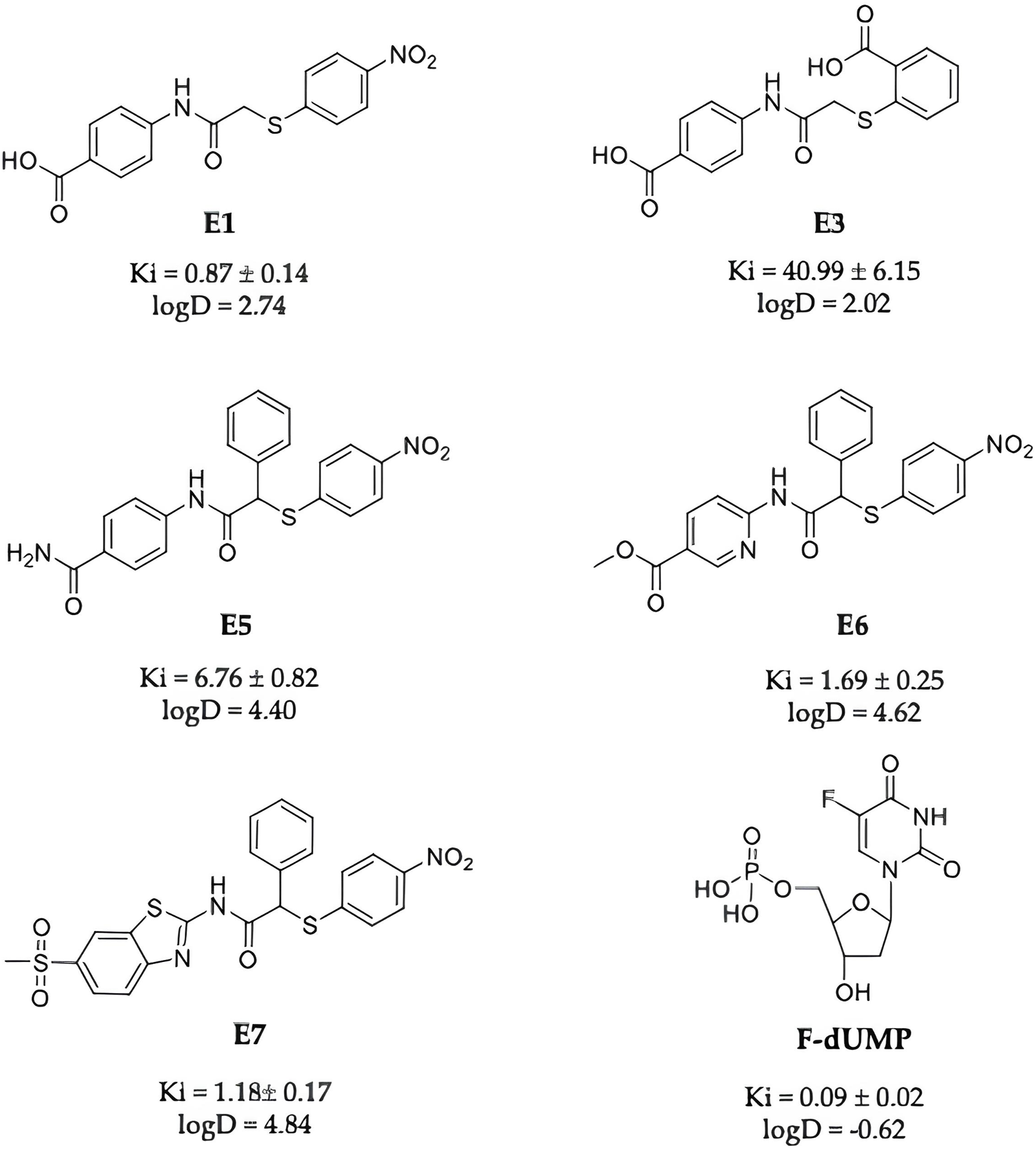 Chemical structures of E1, E3, E5, E6, E7 and FdUMP, their IC50 against the hTS enzyme and logD values at pH 7.4.