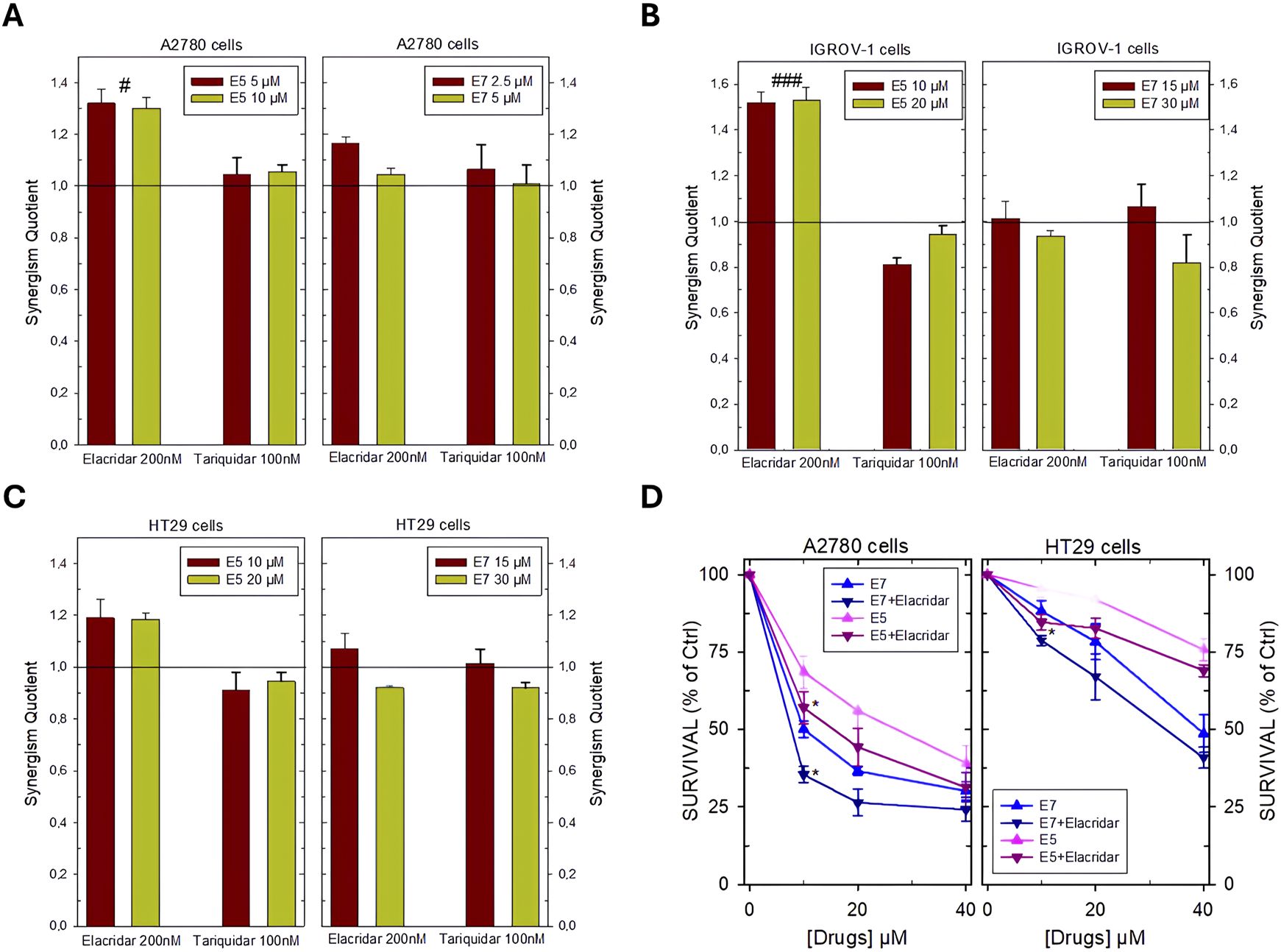 Synergism Quotient values after combining E5 and E7 with inhibitors of membrane ABC transporters in A2780 cells (A), IGROV-1 cells (B) HT29 cells (C). The bars represent the average of the duplicate cell counts from two separate experiments and indicate the values of the synergism quotient obtained by dividing the result of the inhibition of the drug combination by the sum of the inhibition of the single drug. SQ > 1 indicates synergism, while SQ < 1 or = 1 indicates an antagonistic or additive effect, respectively. (D), effects of the combination of E5 and E7 with the inhibitor of the ABC membrane transporters elacridar on the dose-response curves of these Ddis in A2780 and HT29 cell lines. Cells were pre-treated with 200 nM elacridar for 2 h before adding the drugs for an additional 72 h. Data are the mean ± S.D. of three separate experiments performed in duplicate. p values were calculated with two-sided Student’s t-test and ANOVA multiple comparisons. #p < 0.05; ###p < 0.001, comparing samples treated with elacridar or tariquidar. *p < 0.05; versus samples without pump blockers.