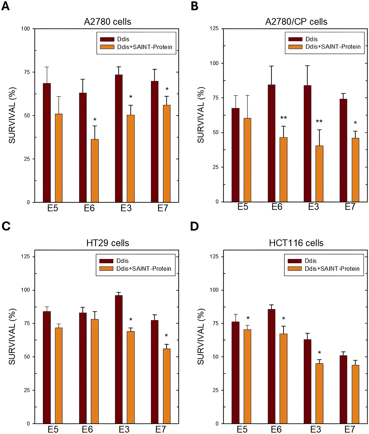 Cell survival after 72 h of treatment with the indicated Ddis drugs in the absence or presence of the SAINT-Protein transfection system in OC A2780 (A) and A2780/CP cell lines (B) and in HT29 (C) and HCT116 (D) CRC cell lines. Data indicate mean values and standard deviation of at least two biological repeats performed in duplicate. p values were calculated with a two-sided Student’s t-test, comparing transfected and non-transfected samples. *p < 0.05; **p < 0.01; versus non transfected samples.