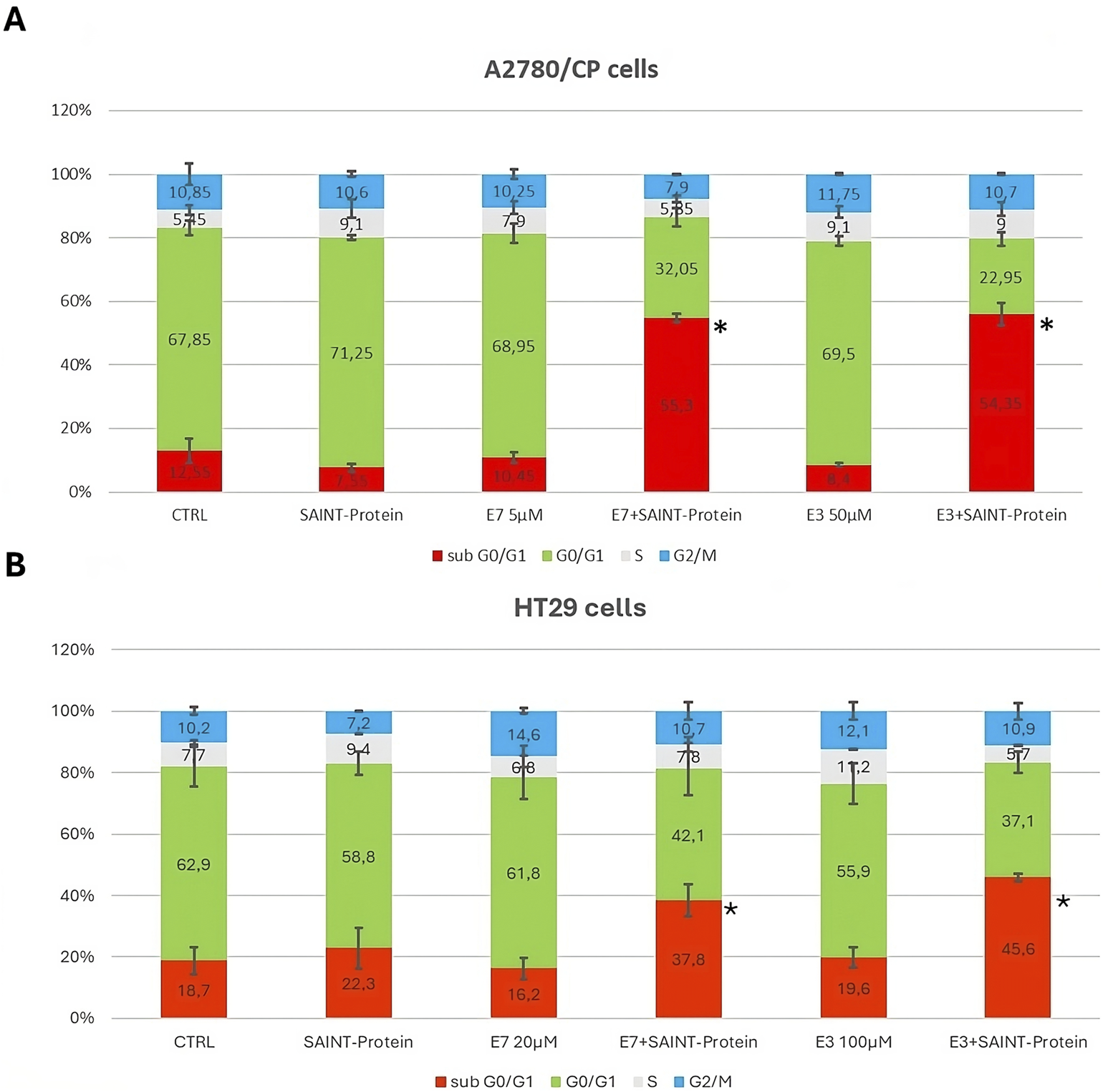 Effect of the combination of the Ddis drugs with SAINT-Protein for 72 h on the distribution of cell cycle phases in the A2780/CP OC cells and HT29 CRC cells by flow cytometric analysis of DNA content with PI staining. The changes in cell distribution at different stages of the cell cycle in A2780/CP cells (A) and HT29 cells (B) were observed when cells were treated with E3 and E7 with or without SAINT-Protein. Inserted numbers indicate the % of cells in the different phases of the cell cycle. Data indicate mean values and standard deviation of at least two biological repeats performed in duplicate. p values were calculated with a two-sided Student’s t-test, comparing transfected and non-transfected samples. *p ≤ 0.05, **p < 0.01, in comparison to non-transfected drug samples.