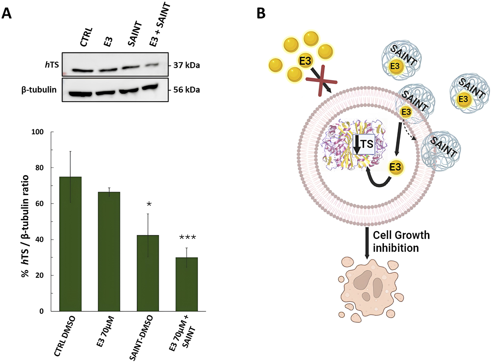 Effects of compound E3 on the expression levels of thymidylate synthase (hTS) protein in HT29 colon cancer cell line, after 48 h of treatment. (A) Representative Western blot and quantification histogram for hTS expression levels after E3 was administered alone or with SAINT™-Protein. β-Tubulin has been used as a housekeeping protein. The bands obtained by immunoblot were analyzed by ImageJ (Java-based image-processing and analysis software). (B) Cartoon illustrating the expected mechanism of transfection of the SAINT-Protein (sphere pale blue) to internalize the drug (yellow sphere) into the cell. Once in the cell, the drug is free to interact with hTS and shift the equilibrium towards the monomer followed by its degradation. This causes the hTS level to decrease and the cell growth inhibition. Cartoon created using BioRender™ free trial plan. Data indicate mean values and standard deviation of at least two biological repeats performed in duplicate. p values were calculated with a two-sided Student’s t-test, comparing transfected and non-transfected samples. *p < 0.05; ***p < 0.001 vs. E3.