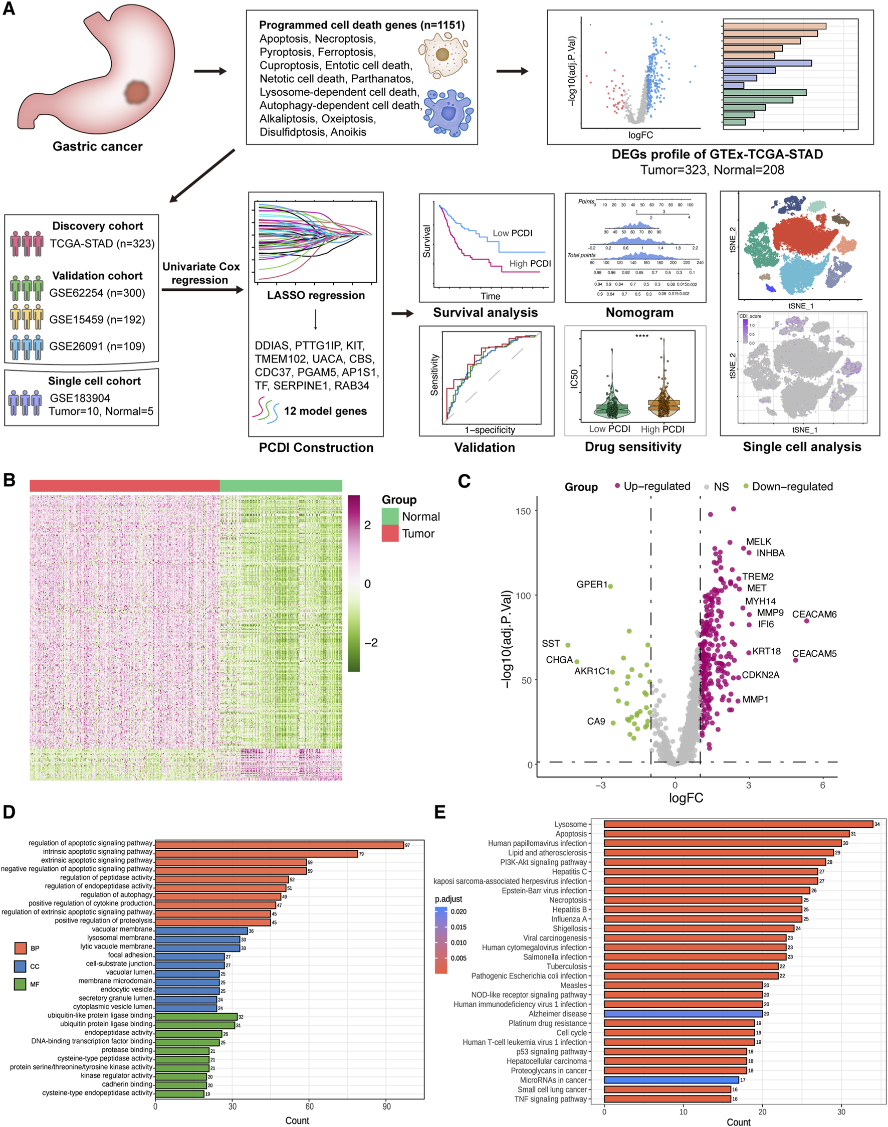 Workflow and DEGs landscape of PCD-Related Genes (A) Schematic diagram of the study’s design. (B) Heatmap displaying the PCD-related DEGs between GC and normal tissues in the TCGA-STAD cohort. (C) Volcano plot illustrating the PCD-related DEGs. Downregulated DEGs are indicated in green, upregulated DEGs in pink, and non-significant genes in grey. Labeled points represent DEGs with an adjusted p-value <0.01 and |log2FC| > 2.5. (D) GO enrichment analysis for the PCD-related DEGs. (E) KEGG enrichment analysis for the PCD-related DEGs. GC, gastric cancer. LASSO, least absolute shrinkage and selection operator. PCD, programmed cell death. DEGs, differentially expressed genes. logFC, log2 (fold change). GO, Gene Ontology. BP, biological process. CC, cellular component. MF, molecular function. KEGG, Kyoto Encyclopedia of Genes and Genomes.