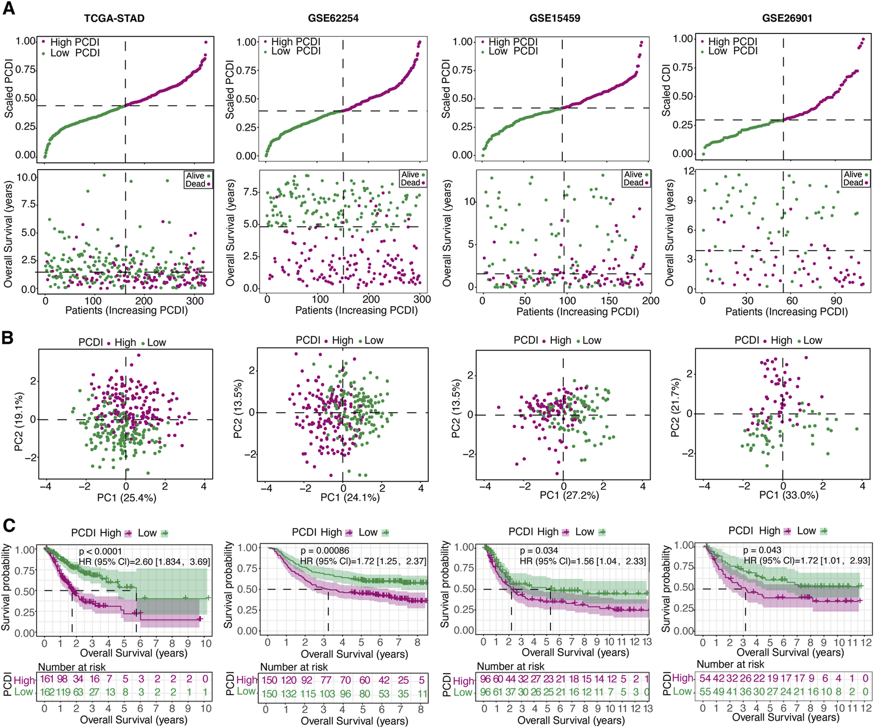 We assessed the OS between different PCDI groups within the TCGA-STAD cohort and found that patients with high-PCDI scores exhibited lower survival rates (Figure 3A). Principal component analysis (PCA) confirmed a satisfactory classification based on PCDI (Figure 3B). A marked difference in OS time was noted between the high- and low-PCDI groups, with the latter showing lower death rates (HR = 2.60, 95% CI: 1.83–3.37, p < 0.0001; Figure 3C). The validation cohorts (GSE62254, GSE15459, and GSE26901) were also analyzed, demonstrating that a high PCDI score was predictive of poor survival outcomes (Figure 3A). PCA validated the separation of these groups (Figure 3B), and Kaplan-Meier analysis confirmed the significantly lower OS rates in the high-PCDI group (all p < 0.05; Figure 3C).