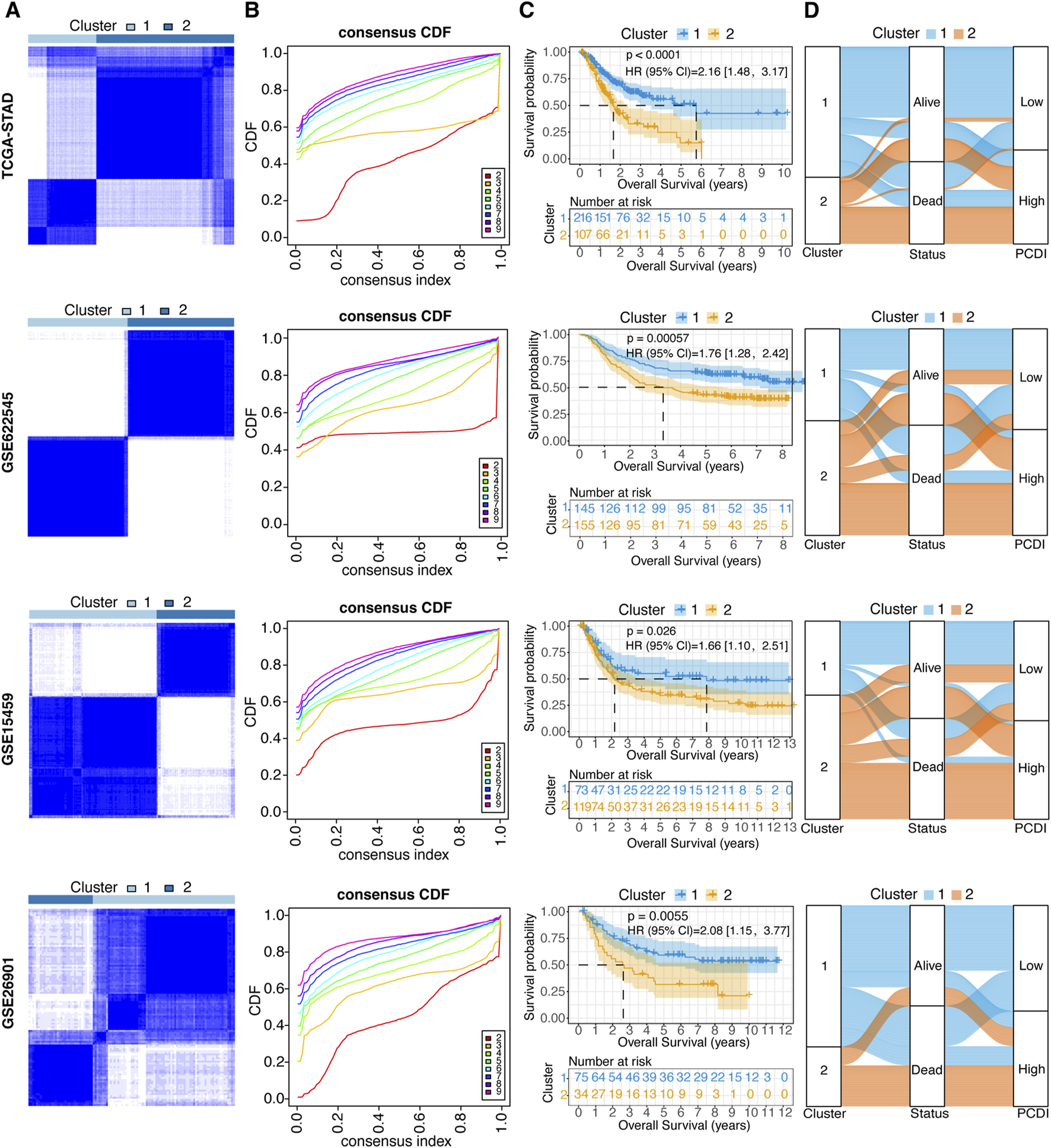 Unsupervised Clustering of PCDI Model Genes (A) Stratification of GC patients into two molecular clusters at k = 2, based on the PCDI model gene profile. (B) CDF plots illustrating the consensus clustering stability for each k value ranging from 2 to 9. (C) Kaplan-Meier survival analysis comparing the prognosis of GC patients across the two identified molecular clusters. (D) Alluvial diagram depicting the relationships among molecular clusters, survival status, and PCDI group classification in GC patients. GC, gastric cancer. PCDI, programmed cell death. CDF, cumulative distribution function.