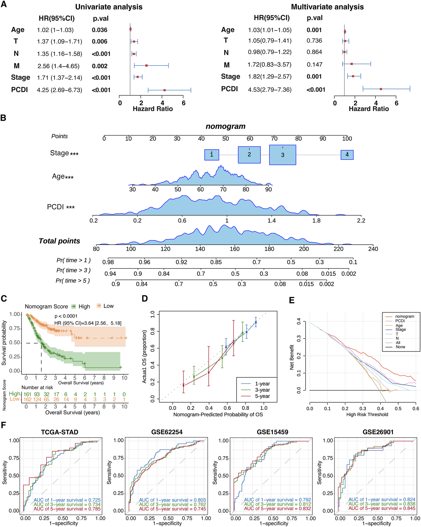 Establishment and Evaluation of the Nomogram Survival Model (A) Univariate and multivariate analyses assessing clinicopathologic features and PCDI within the TCGA-STAD cohort. (B) Development of a nomogram for predicting 1-year, 3-year, and 5-year OS rates for GC patients. (C) Kaplan-Meier survival analyses based on the nomogram scores for the GC patient groups. (D) Calibration plots depicting the predicted probabilities for 1-year, 3-year, and 5-year OS within the TCGA-STAD cohort. (E) DCA evaluating the nomogram’s utility in predicting 1-year, 3-year, and 5-year OS. (F) ROC analysis validating the nomogram’s predictive accuracy across each cohort. PCDI, programmed cell death index. OS, overall survival. GC, gastric cancer. DCA, decision curve analysis. ROC, receiver operating characteristic.