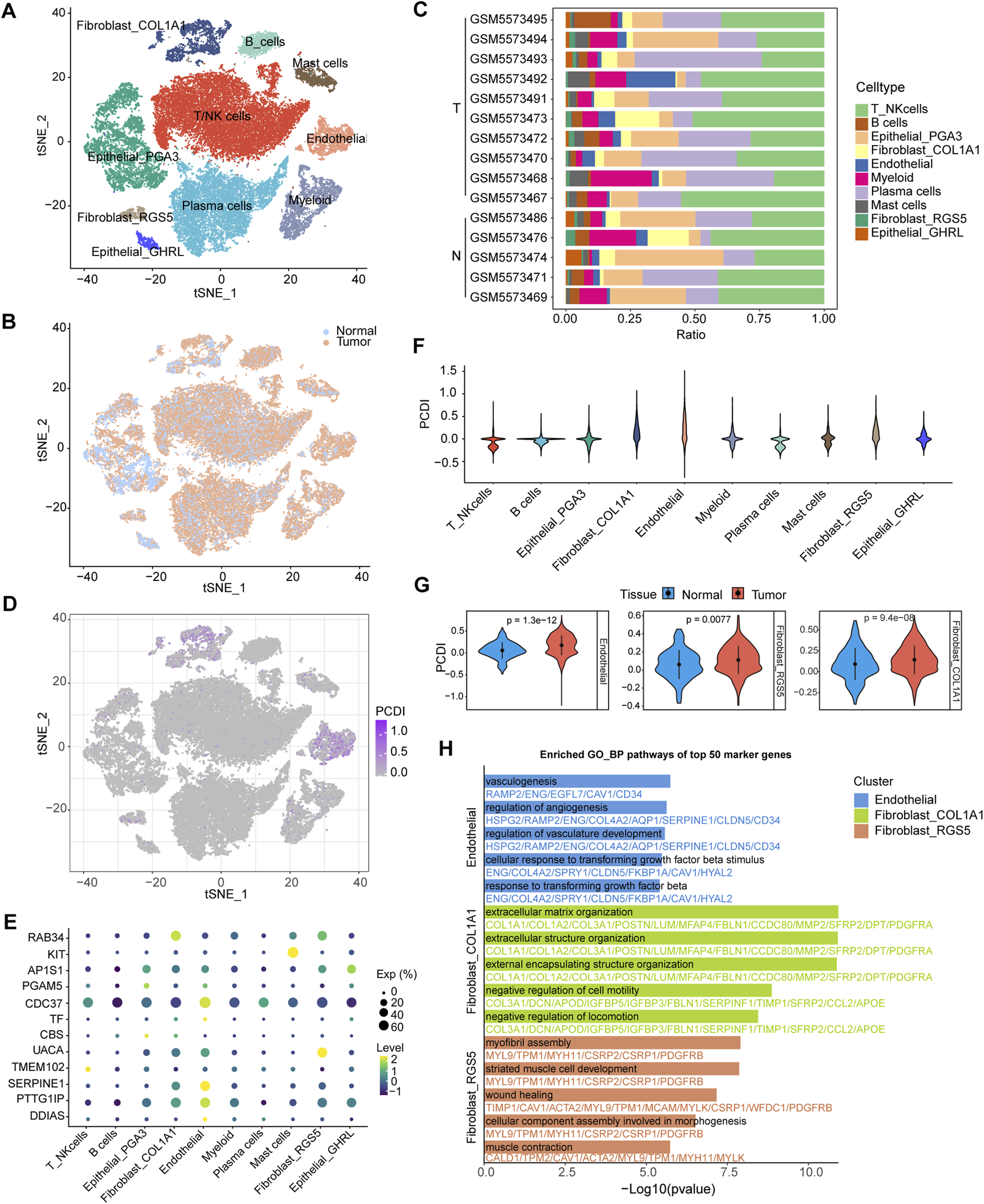 Single-Cell Analysis Based on PCDI (A) t-SNE plot visualizing of all cell types from 10 GC tissues and five normal tissues derived from GSE183904. (B) t-SNE plot showing the cellular origin as either tumor or normal tissue. (C) Bar plots depicting the proportions of cell types of each patient. (D) t-SNE plot visualizing the PCDI scores of different cell types. (E) Bubble plot illustrating the proportion of cells expressing model genes and the average expression levels of these genes across various cell types. (F) Violin plot displaying PCDI scores in each cell type. (G) Violin plots comparing the PCDI scores of endothelial, fibroblast_COL1A1 and fibroblast_RGS5 cells between normal and tumor tissues. (H) Bar plots showcasing GO_BP pathway enrichment for the top 50 marker genes in endothelial, fibroblast_COL1A1 and fibroblast_RGS5 cells. GC, gastric cancer. T, tumor. N, normal. PCDI, programmed cell death index. GO_BP, biological process pathways of Gene Ontology database.