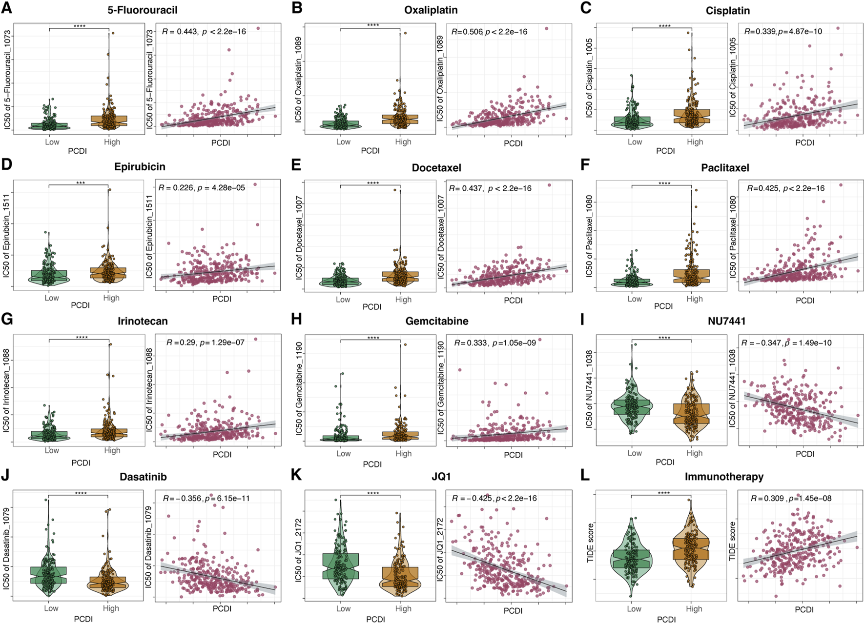 We assessed the relationship between the PCDI scores and drug sensitivity by calculating the half-maximal inhibitory concentration (IC50) values for various drugs in patients with GC. The correlation landscape between drug sensitivity and PCDI is shown in Figures 7A–K. We found that some commonly used drugs for GC, such as 5-fluorouracil (5-FU), oxaliplatin, cisplatin, epirubicin, docetaxel, paclitaxel, irinotecan, and gemcitabine, had higher IC50 values in the high PCDI group, indicating resistance. In contrast, the IC50 values for NU7441, Dasatinib, and JQ1 were lower in the high-PCDI group, suggesting sensitivity to these drugs. Additionally, the TIDE score assessment revealed that patients with low PCDI were associated with lower TIDE scores, suggesting that these patients may benefit more from immunotherapy (Figure 7L).