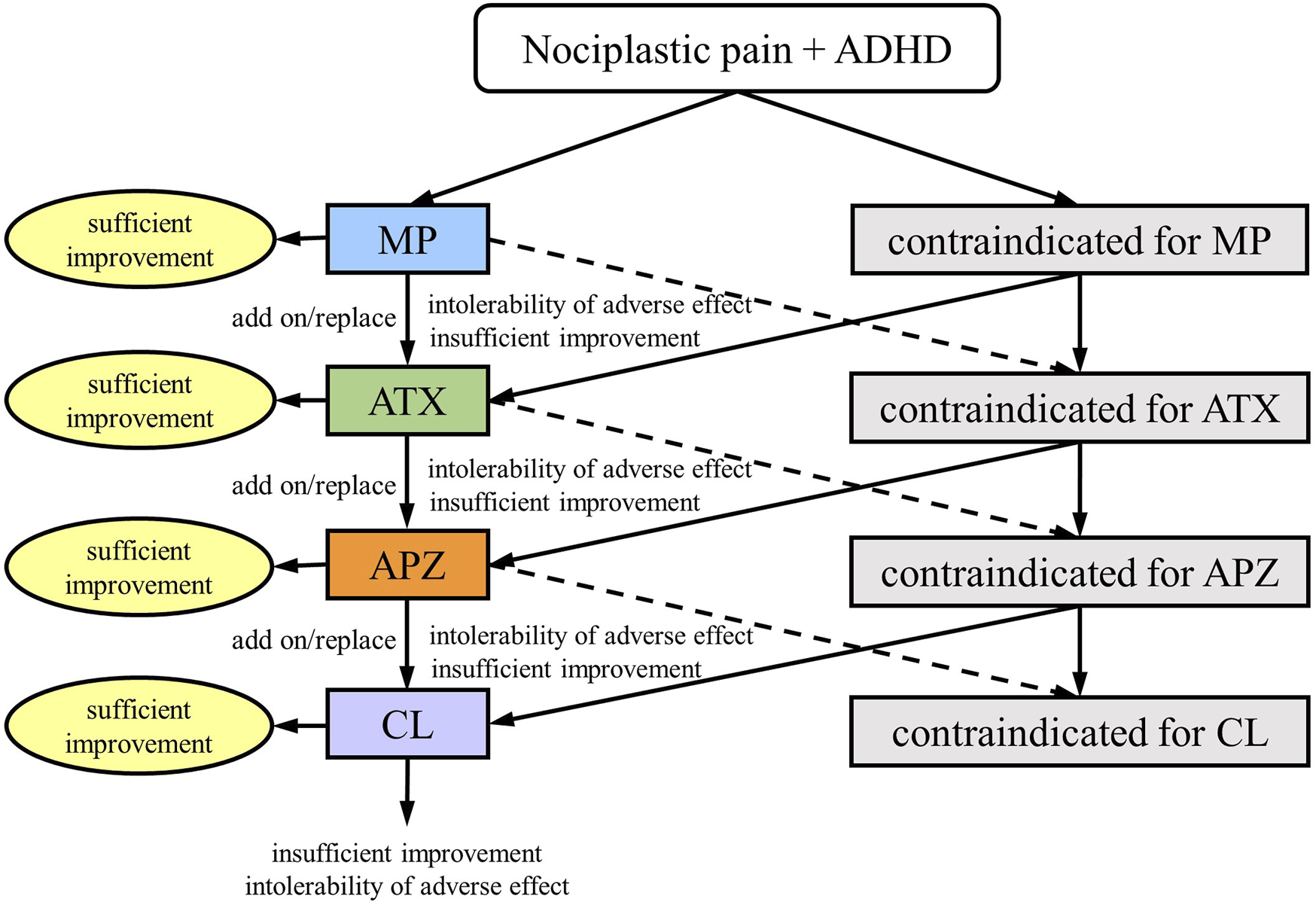 Figure 1. Medication algorithm for nociplastic pain in patients with attention-deficit/hyperactivity disorder (ADHD); MP, methylphenidate; ATX, atomoxetine; APZ, aripiprazole; CL, clonidine. (This figure is a modified excerpt from the original paper by Kasahara et al. (Kasahara S, Takahashi K, Matsudaira K, Sato N, Fukuda KI, Toyofuku A, Yoshikawa T, Kato Y, Niwa SI, Uchida K. Diagnosis and treatment of intractable idiopathic orofacial pain with attention-deficit/hyperactivity disorder. Sci Rep 2023; 13:1,678. DOI: 10.1038/s41598-023-28931-3, CC BY 4.0).