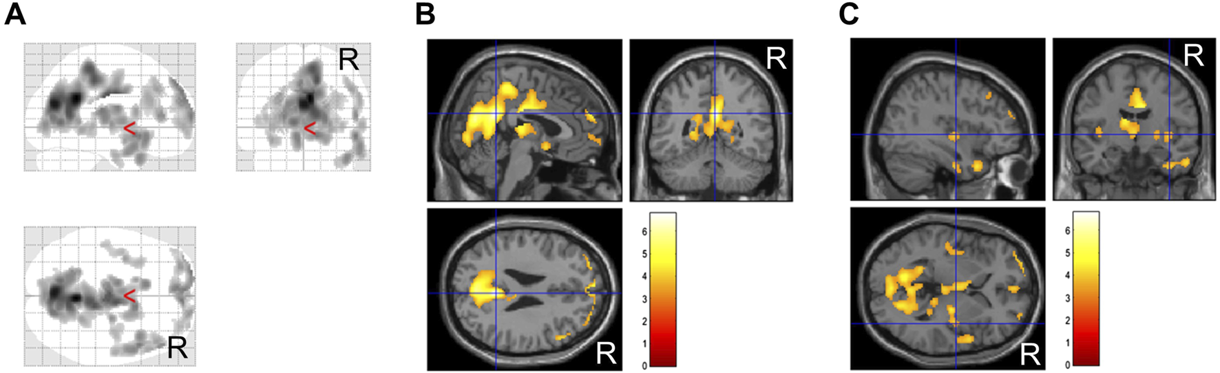Figure 2. Significantly higher cerebral blood flow regions in pre-treatment images than in post-treatment images. The regions with significant changes are projected in three directions in gray (A) and colored (t-value) scales with cross-bars indicating the precuneus (B) and right insular cortex (C). The medial thalamus is also identified as a higher cerebral blood flow region (C). Cluster-extent p < 0.05 with family-wise error correction. R, patients’ right side.