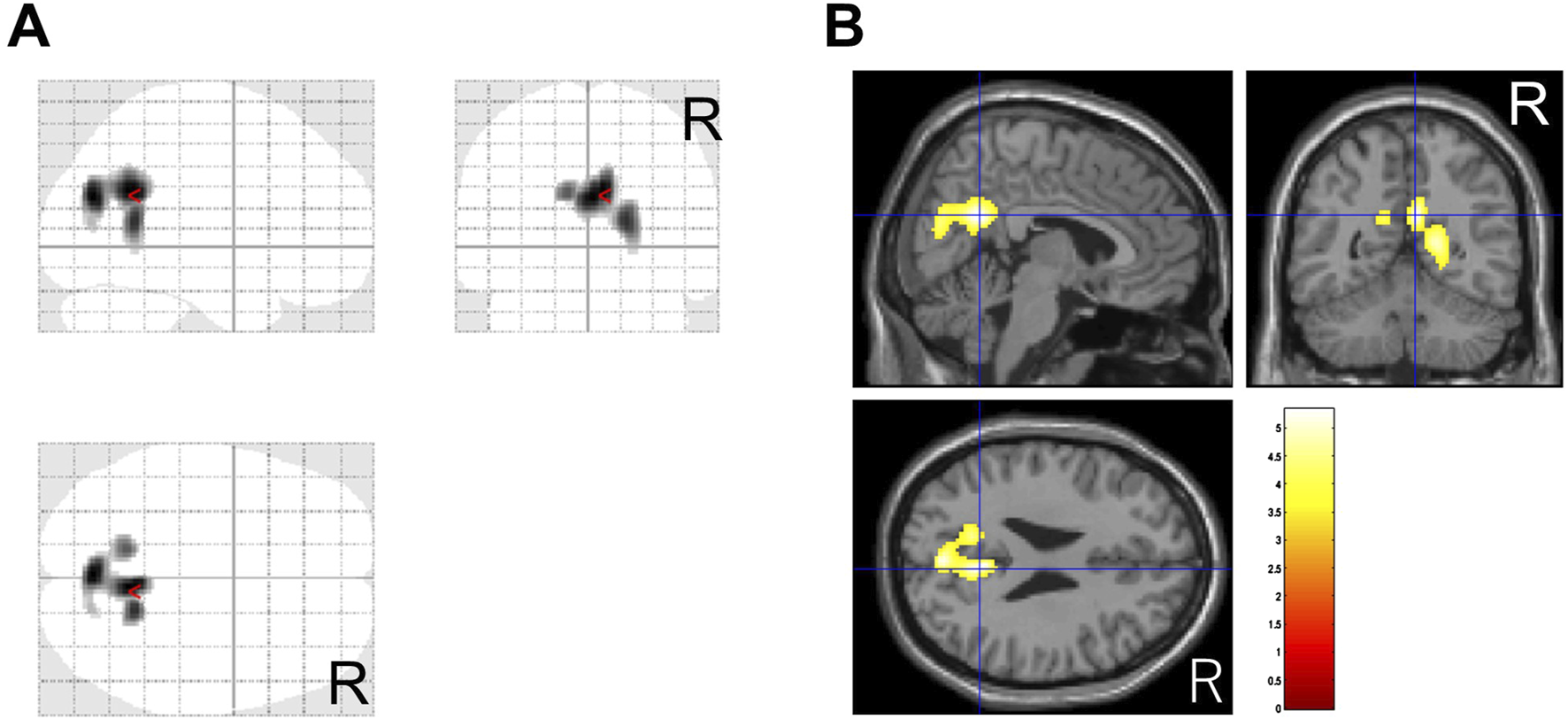 Figure 3. Significantly higher cerebral blood flow regions before methylphenidate treatment than after treatment. The significant regions are projected in three directions in gray (A) and colored (t-value) scales with a cross-bar indicating the precuneus (B). Cluster-extent p < 0.05 with family-wise error correction. R, patients’ right side.