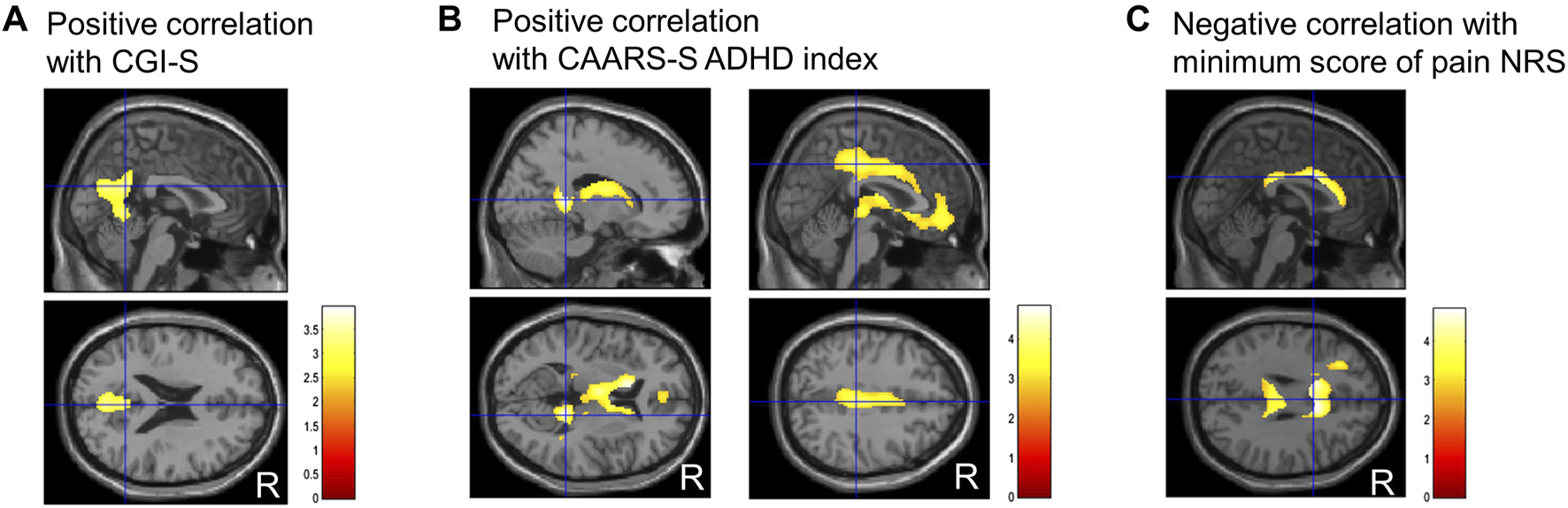 Figure 4. Representative images of significantly correlated regions with clinical scores. Clinical global impressions severity (CGI-S) score positively correlates with the precuneus (A). ADHD index, a subscale of Conners’ adult ADHD rating scale self-report (CAARS-S), positively correlates with the isthmus of the posterior cingulate gyrus, anterior and middle cingulate gyrus, medial thalamus, and caudate head (B). The minimum numerical rating scale (NRS) score for pain negatively correlates with the narrow region along the corpus callosum in the cingulate gyrus (C). Cluster-extent p < 0.05 with family-wise error correction. R, patients’ right side; ADHD, attention-deficit/hyperactivity disorder.