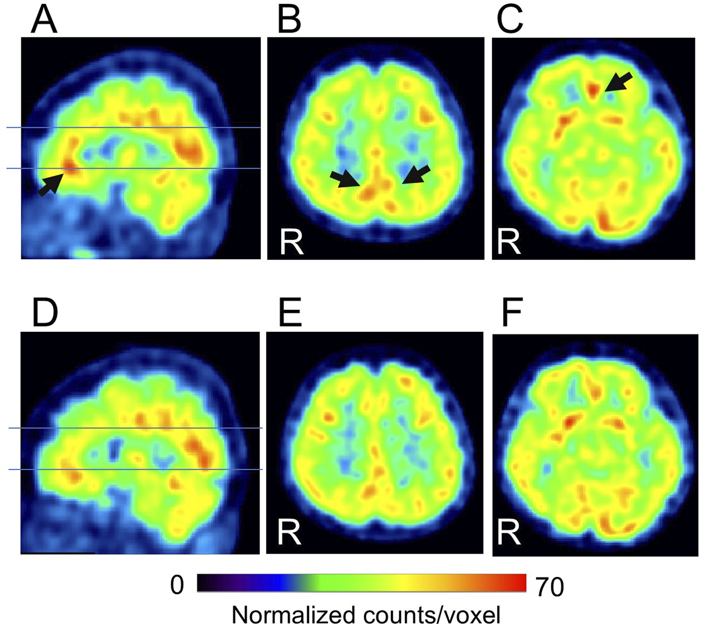Figure 6. Representative images of cerebral blood flow single-photon emission tomography (SPECT) with typical findings that the subgenual anterior cingulate arrow in (A, C) and precuneus arrows in (B) show relative hyperperfusion before treatment (A–C), which decreases after treatment (D–F) (patient # 45). The lines in A and D indicate the axial levels of images (B, C, E, F). The voxel values are normalized by the mean number of counts per voxel in the cerebellum being 50; the color ranges from 0 to 70. R, patients’ right side. This case had no psychiatric comorbidities based on the Diagnostic and Statistical Manual of Mental Disorders, fifth edition. At the time of the pre-treatment SPECT, the patient was not taking any medications. At the time of the post-treatment SPECT, the medications were 10 mg/day of atomoxetine, 225 mg/day of venlafaxine, and 5 mg/day of zolpidem tartrate.