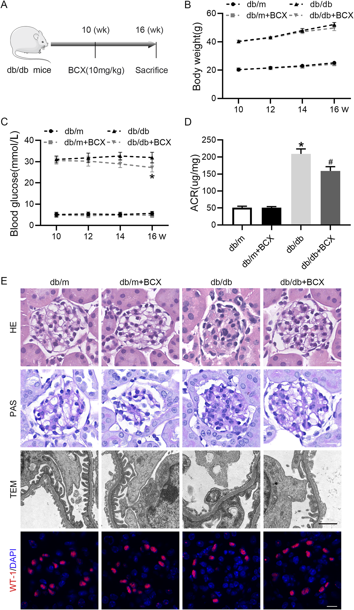 Figure 1. Effects of BCX on functional and morphological characteristics in kidney of db/db mice. (A) A schematic diagram showing the intervention-study design. (B) Body weight changes in each group. (C) Blood glucose levels in each group. (D) Urine ACR levels in each group. (E) Representative HE stanning images (scale bar = 50 μm), PAS stanning images (scale bar = 50 μm) transmission electron microscopy (TEM) images (scale bar = 1 μm), and Wilms’ Tumor 1 (WT1, red) IF images (scale bar = 50 μm) in glomeruli from each group. *p < 0.05 vs. control group; #p < 0.05 vs. db/db group, n = 6.