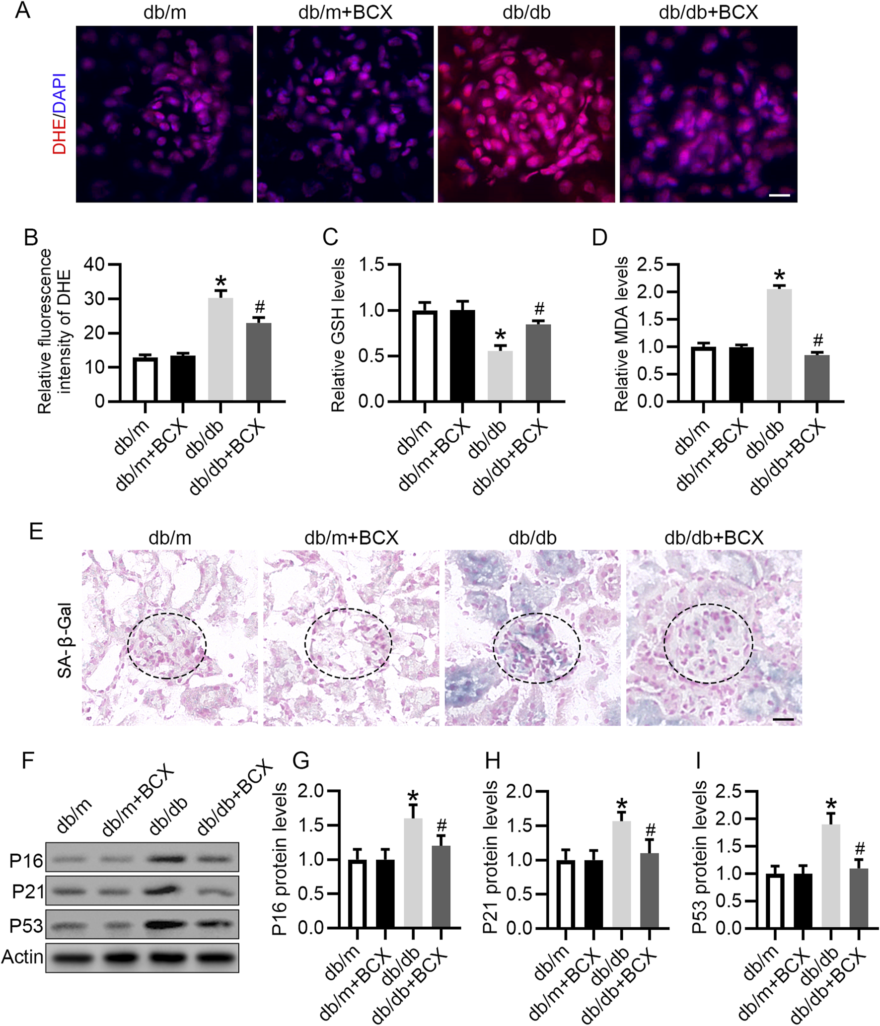 Figure 2. BCX attenuates oxidative stress and aging in glomeruli of db/db mice. (A) Oxidative stress level of glomeruli was evaluated by DHE staining from different groups, Scale bar = 10 μm. (B) Quantification of DHE fluorescence intensity from panel A. (C) GSH concentrations in kidney cortexes from each group. (D) MDA concentrations in kidney cortexes from each group. (E) Representative SA-β-gal activity staining in kidney from each group, Scale bar = 25 μm. (F) Representative images of P16, P21, and P53 protein expression in glomeruli from different groups, n = 6. (G–I) Quantitative analysis of P16, P21, and P53 protein levels from panel F *p < 0.05 vs. control group; #p < 0.05 vs. db/db group, n = 6.