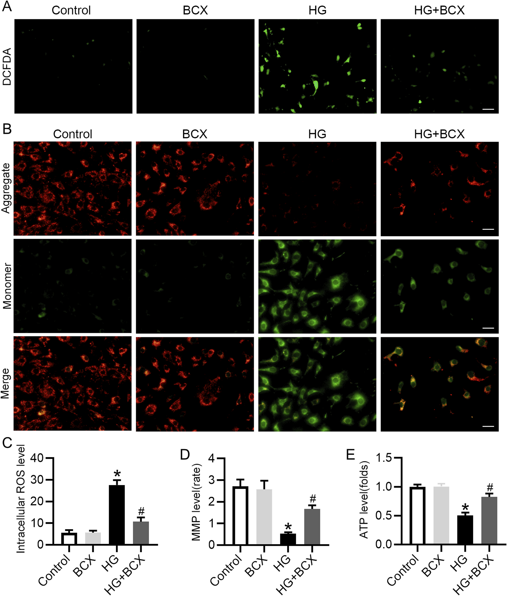 BCX ameliorates HG-induced oxidative stress, mitochondrial dysfunction in podocytes. (A) A representative image of DCFDA staining in podocytes from each group, Scale bar = 100 μm, n = 3. (B) A representative image of JC-1 staining in podocytes from each group, Scale bar = 100 μm, n = 3. (C) Quantitative of ROS content from panel A. (D): Quantitative of mitochondrial membrane potential from panel B. (E): Relative ATP content in podocytes from each group, n = 3. *p < 0.05 vs. control group; #p < 0.05 vs. HG group.