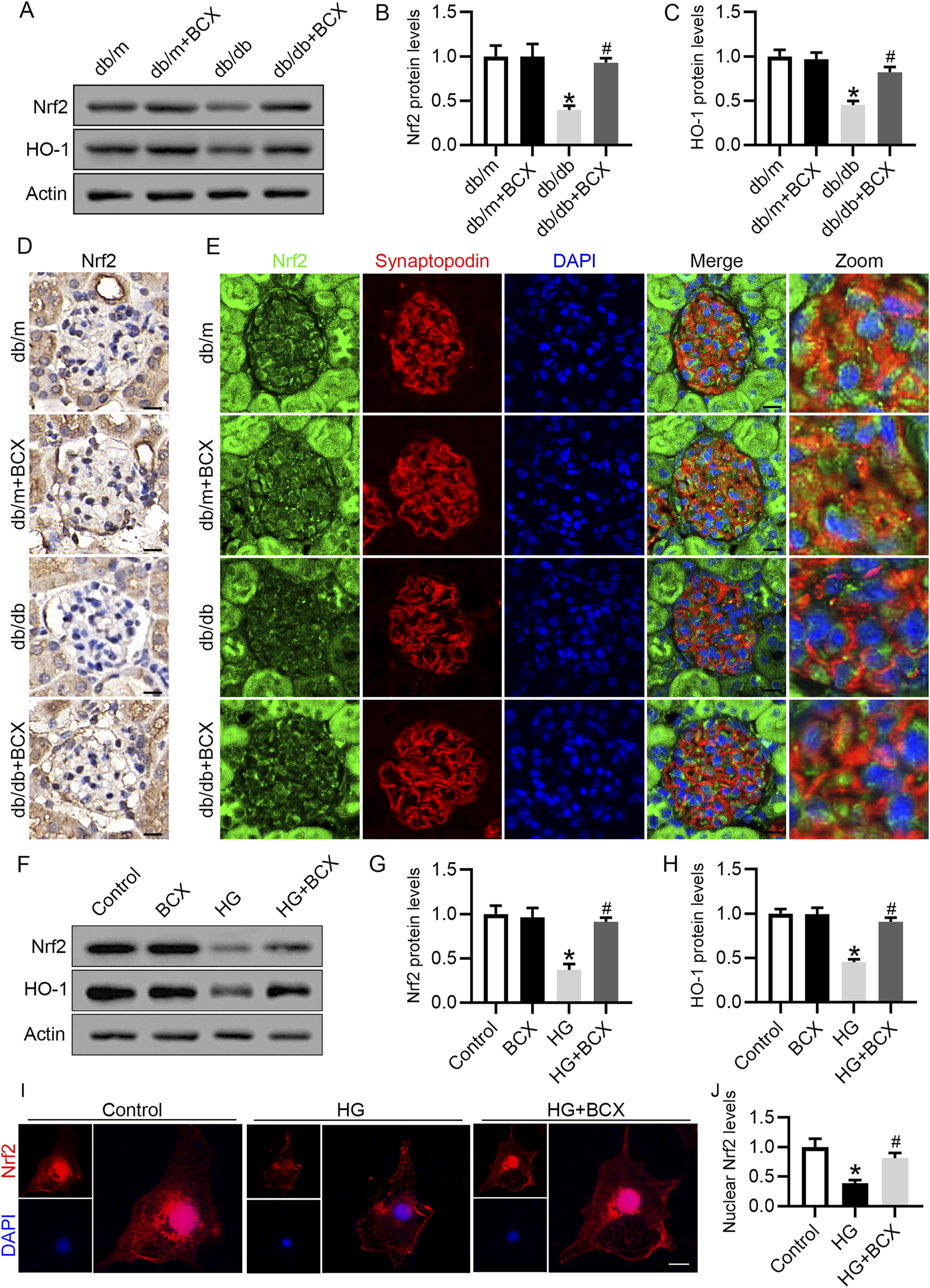 Figure 5. Effects of BCX on Nrf2/HO-1 pathway in podocytes in vivo and in vitro (A) Representative images of Nrf2 and HO-1 protein expression in glomeruli in the different groups, n = 6. (B, C) Quantitative analysis of Nrf2 and HO-1 protein levels from panel A. (D) Immunohistochemical analysis of Nrf2 in glomeruli from different groups, Scale bar = 10 μm, n = 6. (E) Representative fluorescence microscope images of Nrf2 (green), Synaptopodin (red), DAPI (blue) in glomeruli from different groups, Scale bar = 10 μm, n = 6. (F) Representative images of Nrf2 and HO-1 protein expression in podocytes, n = 3. (G, H) Quantitative analysis of Nrf2 and HO-1 protein levels from panel F. (I) Representative fluorescence microscope images of Nrf2 in podocytes, Scale bar = 20 μm, n = 3. (J) Quantitative analysis of nuclear expression levels of Nrf2. *p < 0.05 vs. db/m or control group; #p < 0.05 vs. db/db or HG group.