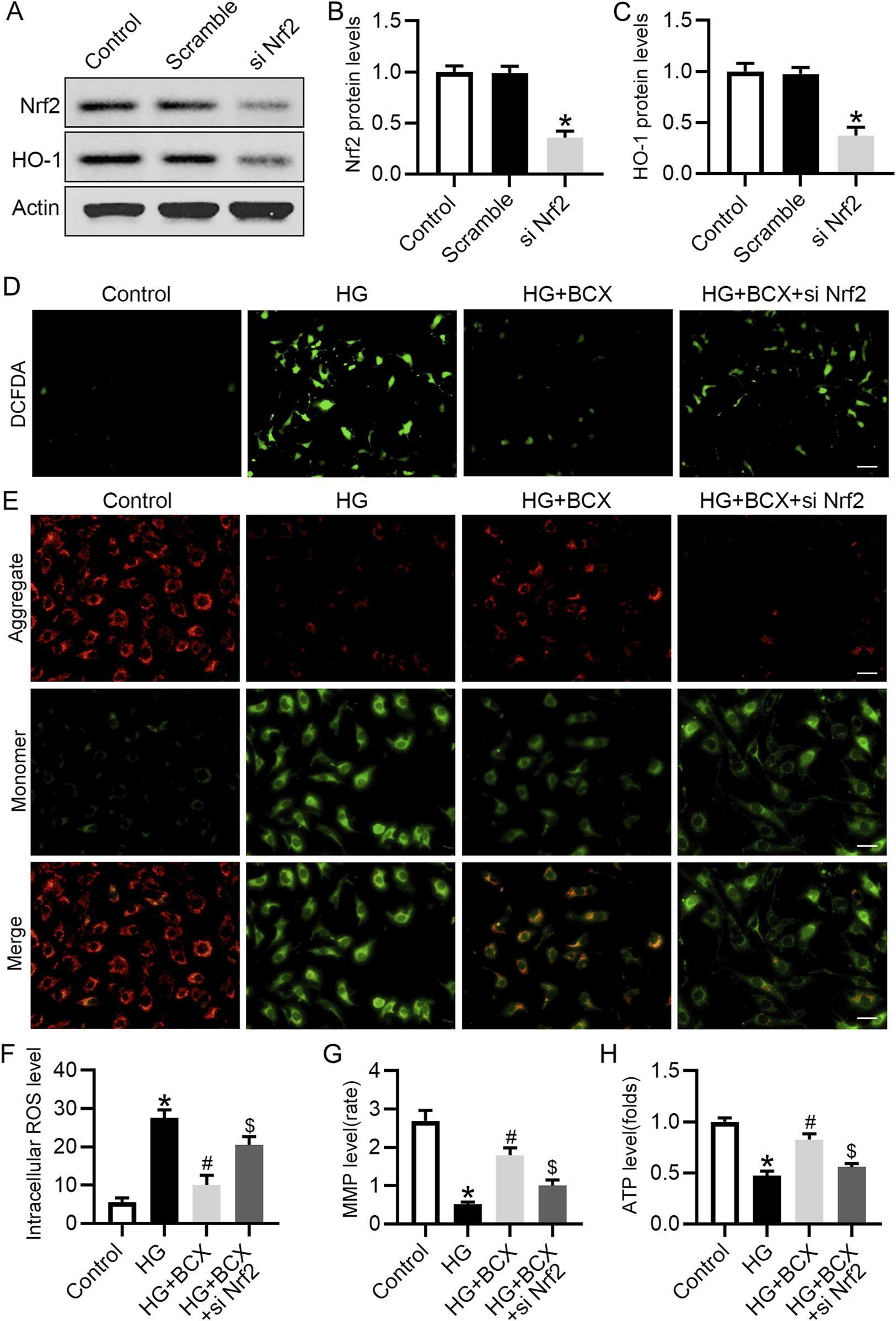 Figure 6. Knockdown of Nrf2 blocked anti-oxidative stress effect of BCX in podocytes. (A) Representative images of Nrf2 and HO-1 protein expression in podocytes, n = 3. (B, C) Quantitative analysis of Nrf2 and HO-1 protein levels from panel A. (D) A representative image of DCFDA staining in podocytes from each group, Scale bar = 100 μm, n = 3. (E) A representative image of JC-1 staining in podocytes from each group, Scale bar = 100 μm, n = 3. (F) Quantitative of ROS content from panel D. (G): Quantitative of mitochondrial membrane potential from panel E. (H): Relative ATP content in podocytes from each group, n = 3. *p < 0.05 vs. control group; #p < 0.05 vs. HG group, $p < 0.05 vs. HG + BCX group.