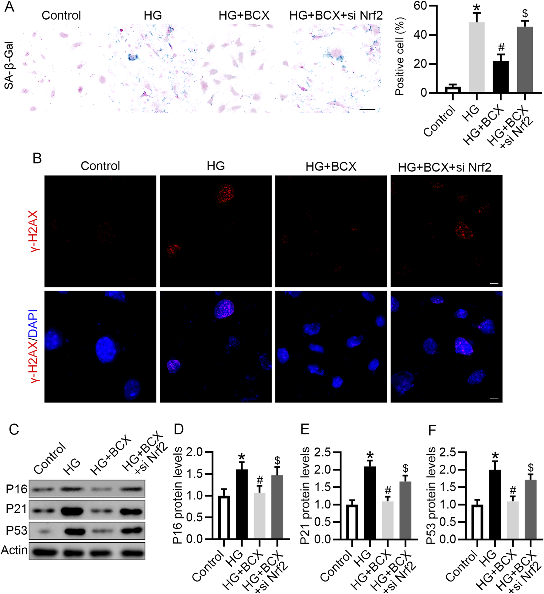Figure 7. Knockdown of Nrf2 blocked the anti-senescence effect of BCX in podocytes. (A) Representative SA-β-gal activity staining in podocytes and the quantification of positive cells from each group, Scale bar = 50 μm, n = 3. (B) Representative γ-H2AX staining (red) in podocytes from each group, Scale bar = 10 μm, n = 3. (C) Representative images of P16, P21, and P53 protein expression in podocytes from different groups, n = 3. (D–F) Quantitative analysis of P16, P21, and P53 protein levels from (D). *p < 0.05 vs. control group; #p < 0.05 vs. HG group, $p < 0.05 vs. HG + BCX group.