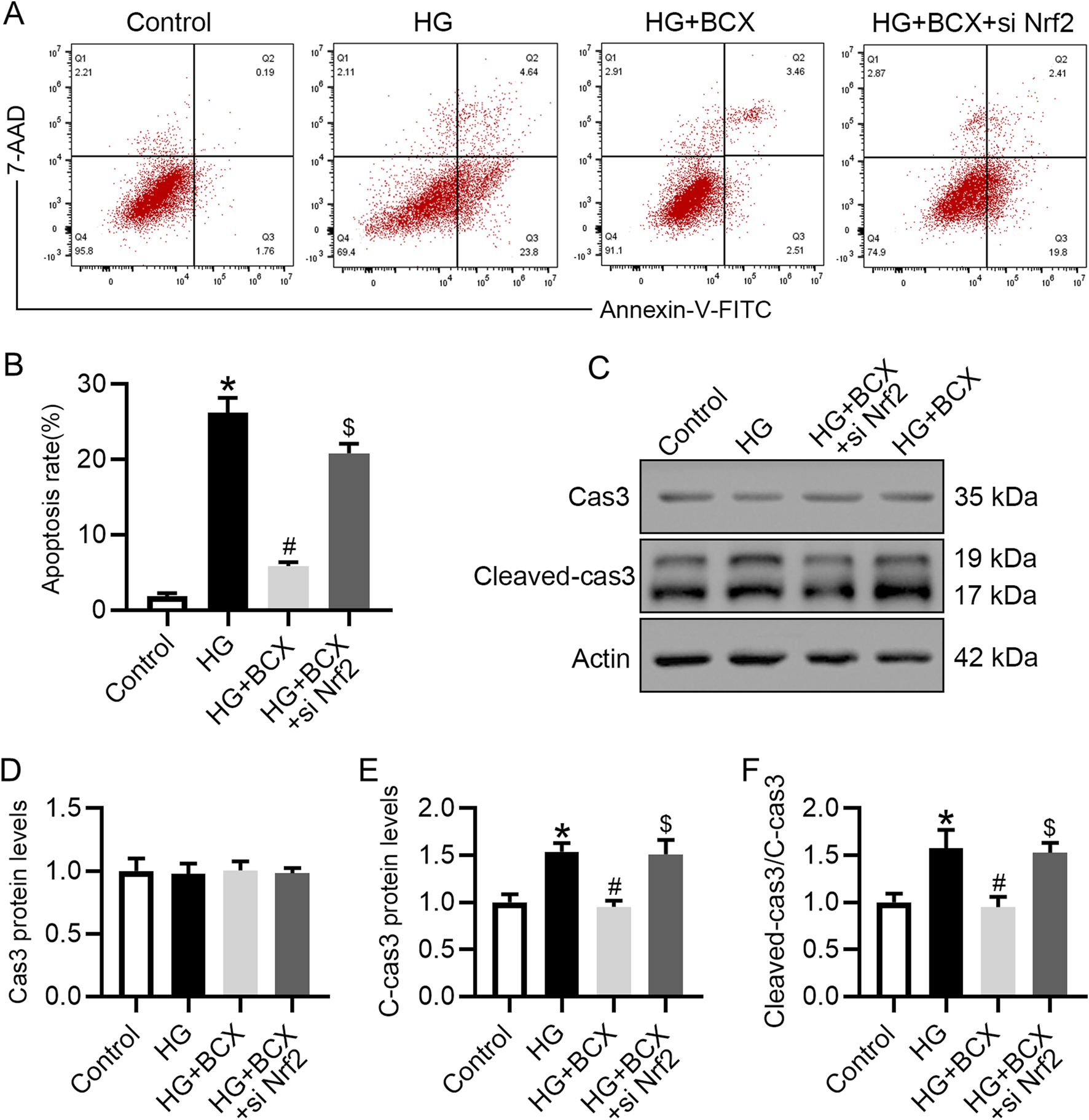 Figure 8. Silencing Nrf2 reversed the protective effect of BCX against the HG-induced podocyte apoptosis. (A) Flow cytometry analysis of podocyte apoptosis in different groups, n = 3. (B) The apoptosis rates from panel A. (C) Representative images of Cas3 and cleaved-cas3 protein expression in podocytes, n = 3. (D–F) Quantitative analysis of Cas3, cleaved-cas3 protein levels and cleaved-cas3/Cas3 ration from panel C. *p < 0.05 vs. control group; #p < 0.05 vs. HG group, $p < 0.05 vs. HG + BCX group.