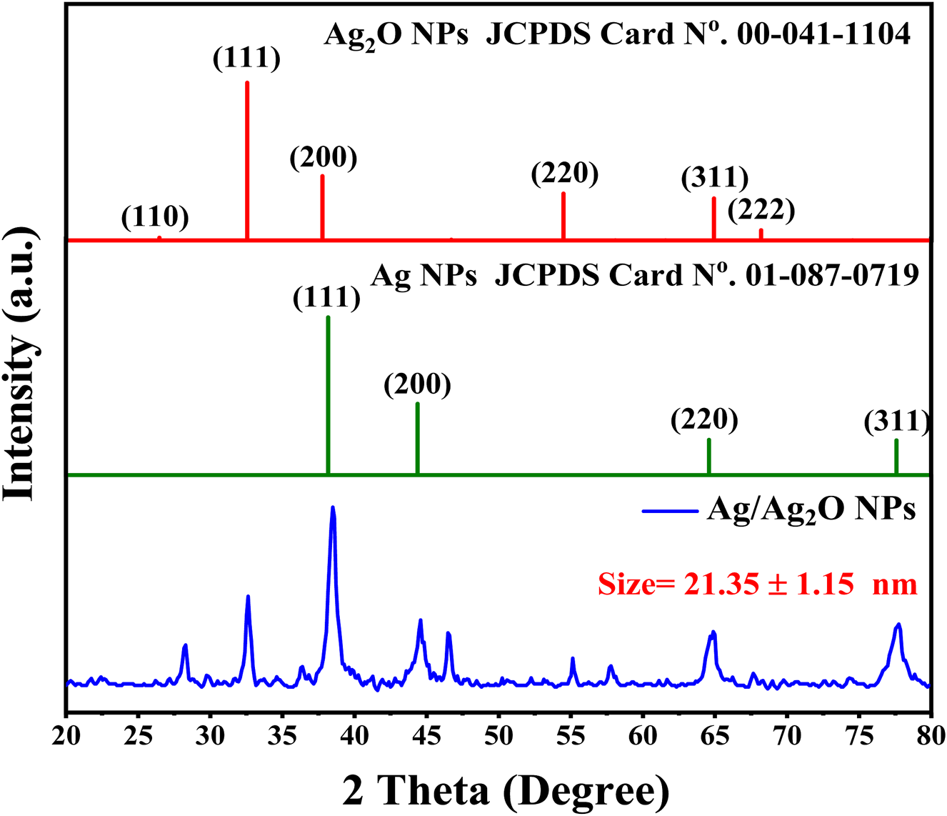 Crystal structure and composition of the Ag/Ag2O nano-powder were extensively analyzed using X-ray diffraction (XRD), as illustrated in Figure 1. The XRD pattern reveals distinct peaks corresponding to both silver (Ag) and silver oxide (Ag₂O). Specifically, diffraction peaks at 2θ angles of 26.48°, 32.46°, 37.8°, 54.35°, 64.85°, and 68.15° correspond to the (110), (111), (200), (220), (311), and (222) planes of cubic Ag₂O, according to the Joint Committee on Powder Diffraction Standards (JCPDS Card No. 00-041–1,104) (Markgraf and Reader, 1985). Concurrently, peaks at 2θ values of 38.15°, 44.45°, 64.5°, and 77.65° match the (111), (200), (220), and (311) planes of face-centered cubic (fcc) metallic Ag (JCPDS Card No. 01-087–0,719) (Bouafia and Laouini, 2020). These results confirm the successful synthesis of Ag/Ag₂O NPs, distinctly identifying the silver and silver oxide phases. The well-defined peaks indicate high crystallinity, which is essential for their application in catalysis and electronic devices (Bouafia et al., 2021a). The average crystallite sizes of the NPs were determined using the Debye–Scherrer equation, revealing sizes of approximately 23.36 nm for Ag/Ag2O NPs (from peaks at 2θ values of 26.48°, 32.46°, and 37.8°) and 19.34 nm for Ag/Ag2O NPs(from peaks at 2θ values of 38.15° and 44.45°) (Bouafia and Laouini, 2021).