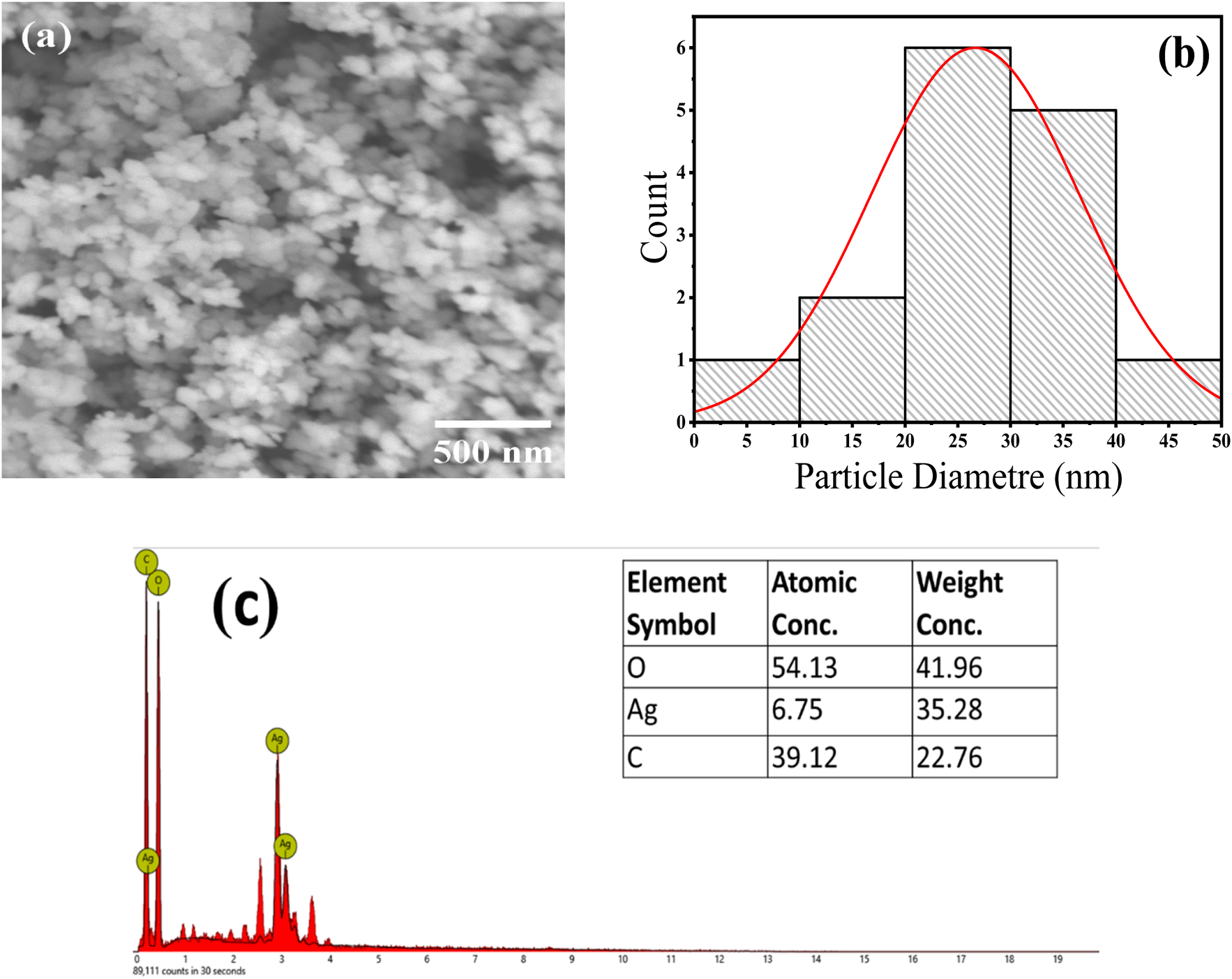 SEM analysis of the Ag/Ag₂O NPs shows that they mainly have spherical to oval shapes, reflecting high morphological uniformity, as depicted in Figure 3A. This uniformity is attributed to the bioactive compounds in the Olea europaea leaf extract, which act as reducing and capping agents. These compounds control the size and shape of the NPs, leading to a consistent particle size of around 25 nm shown in Figure 3B. The narrow size distribution confirms the effectiveness of the biosynthesis process and the significant influence of the leaf extract’s phytochemicals on nanoparticle formation.