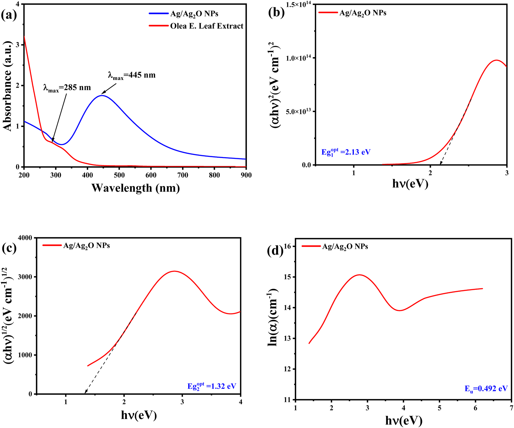 Optical properties of Ag/Ag₂O NPs synthesized from Olea europaea Leaf Extract: (A) UV-vis spectra (B) direct bandgap energy (C) indirect bandgap energy (D) the Urbach energy (Eu).