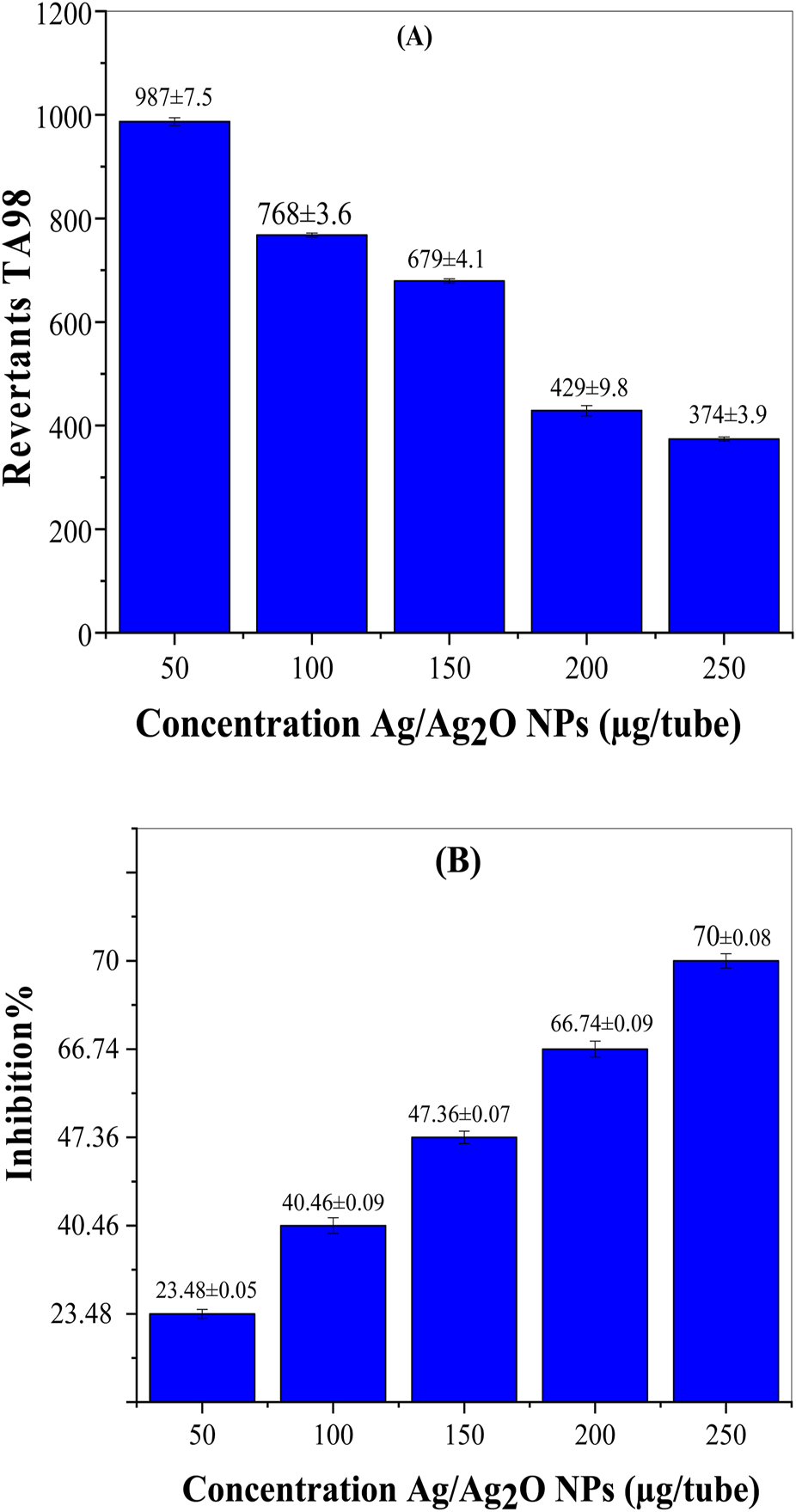 Antimutagenic activity of the Ag/Ag₂O NPs biosynthesized by aqueous extract of O. europaea leaves against 1-NP in S. typhimurium TA98. (A) Revertants TA98, (B) Inhibition %.