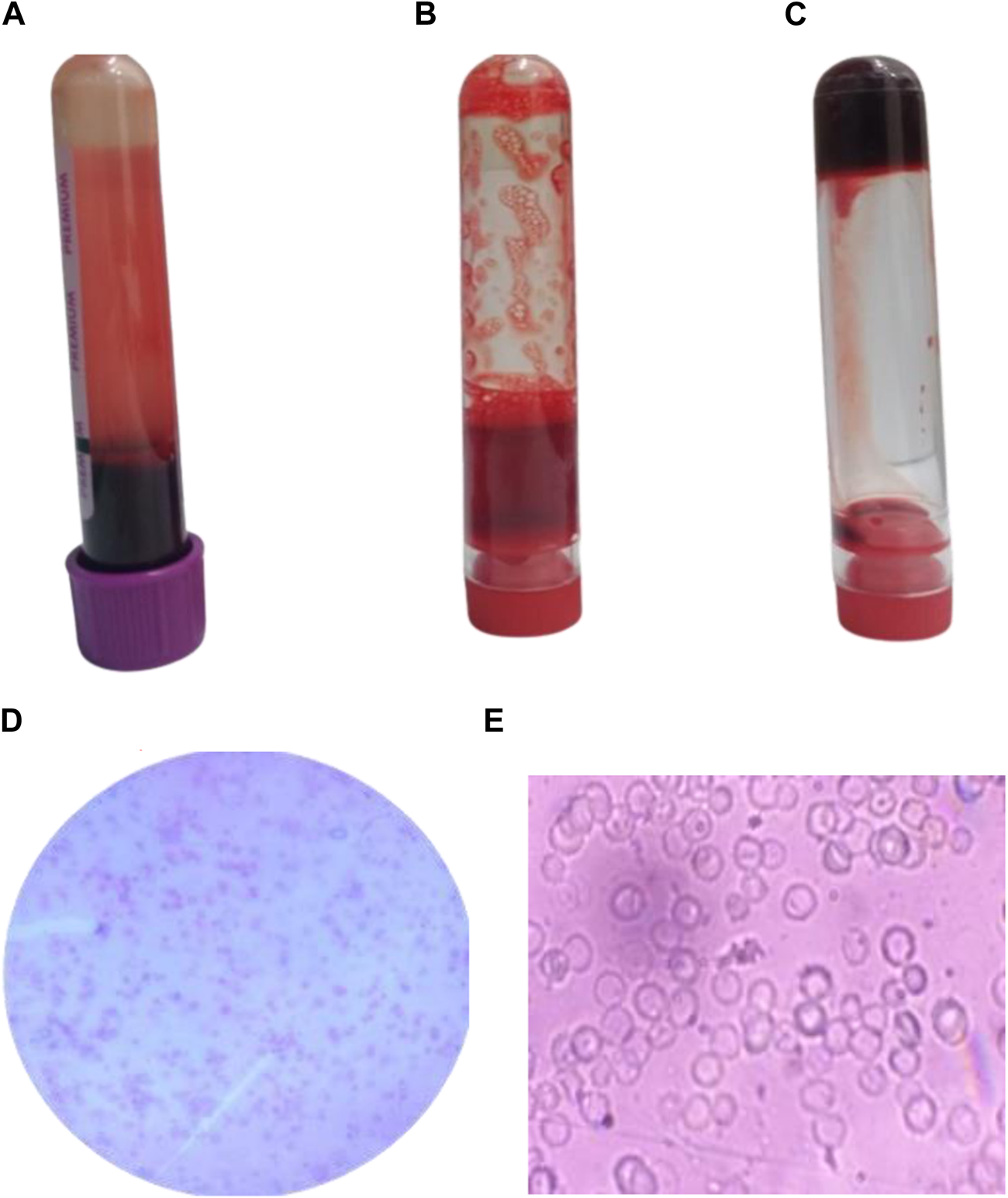 Anticoagulant activity of Ag/Ag2O NPs synthesized using O. europaea: (A) Blood sample in EDTA tube, (B) Blood sample treated with 150 ppm Ag/Ag₂O NPs, (C) Blood control samples without any additives, (D, E) Microscopic examination of blood samples treated with 150 ppm Ag/Ag2O NPs.