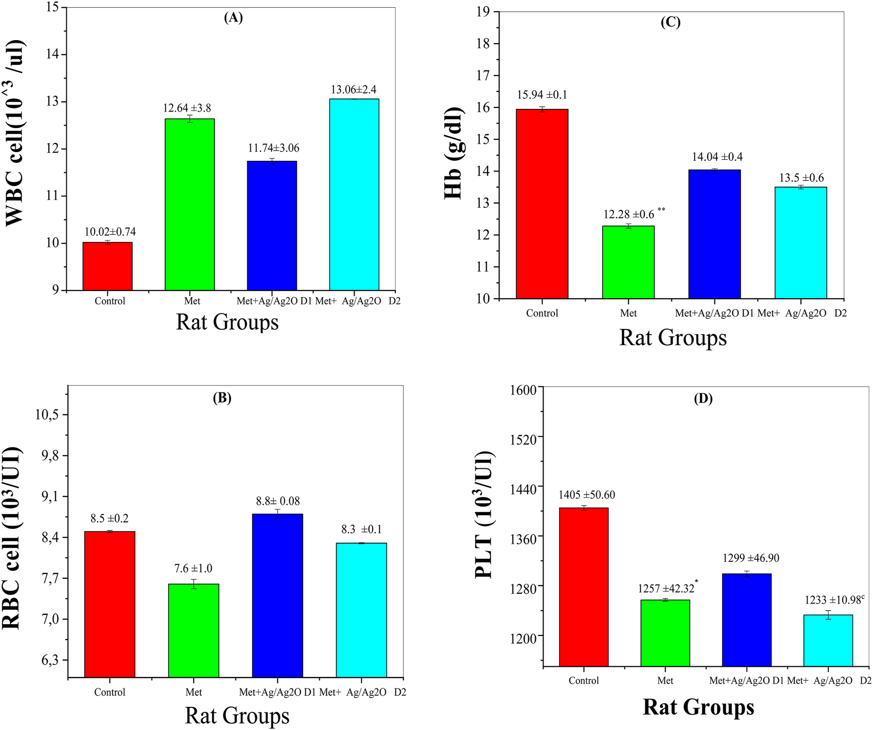 Hematological parameters are key indicators of an organism’s health, particularly under toxic exposure and therapeutic interventions. This section examines the effects of metribuzin and Ag/Ag₂O NPs on WBC, RBC, and PLT counts, highlighting their role in countering metribuzin-induced hematotoxicity.