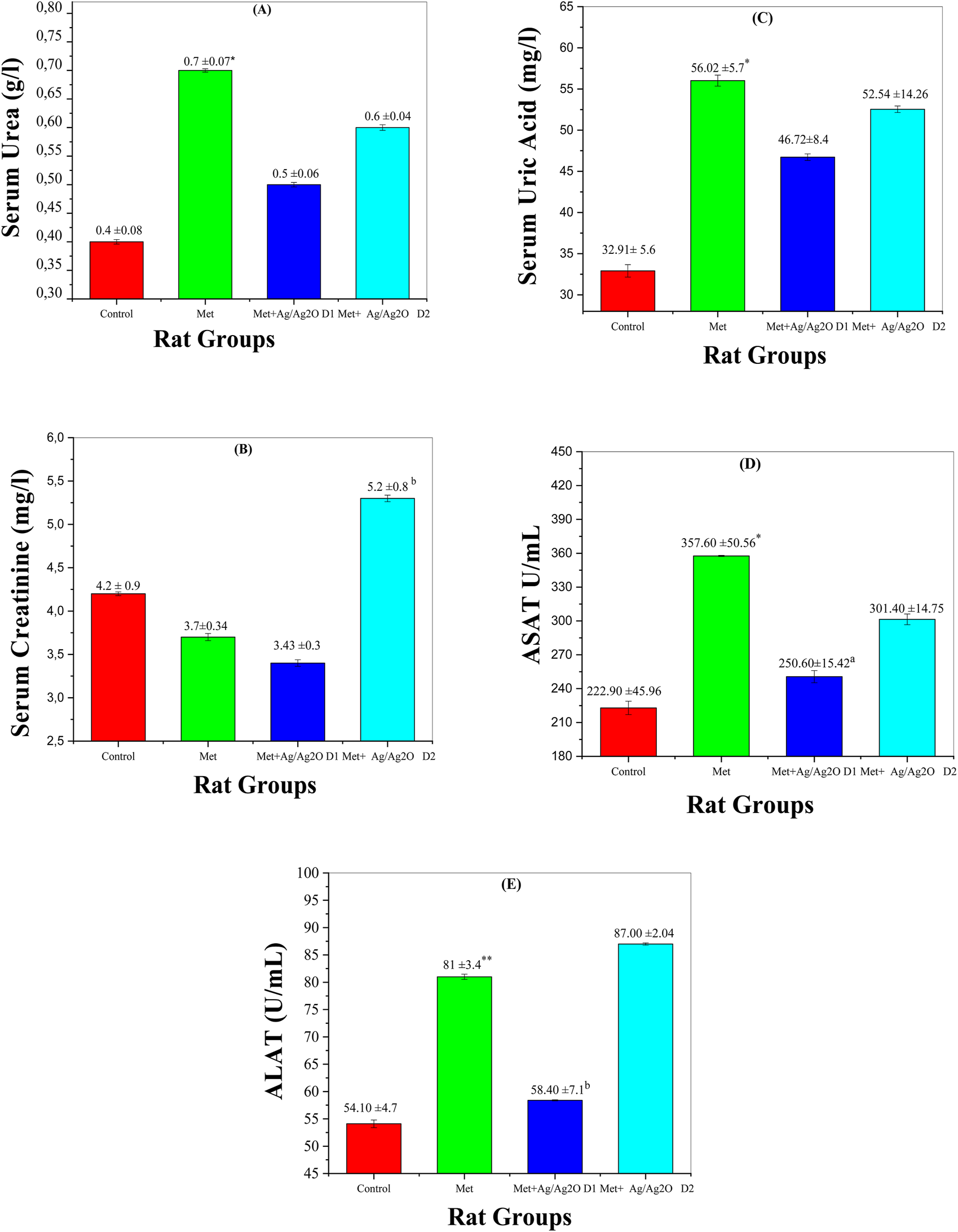 Comparison of serum biomarker levels in the four rat groups. Group I (Control): Normal water consumption. Group II (Met): addition of Metribuzin (110 mg/kg body weight/day) in drinking water for 21 days. Group III (Met + Ag/Ag2O NPs 0.062 mg/kg): Met exposure (as in Group II) followed by Ag/Ag2O NPs (dose 0.0625 mg/kg, body weight/day by intraperitoneal injection) for 21 days. Group IV (Met + Ag/Ag2O NPs0.125 mg/kg): Met exposure (as in Group II) followed by Ag/Ag2O NPs (dose 0.125 mg/kg, body weight/day by intraperitoneal injection) for 21 days. (A): (Serum glucose g/L), (B): Serum cholesterol (mg/L), (C): Serum triglycerides (g/L), (D): HDL g/dL), (E): LDL mg/dL. *p < 0.05, vs. Group I), a p < 0.05, b p < 0.01 vs. Group II.