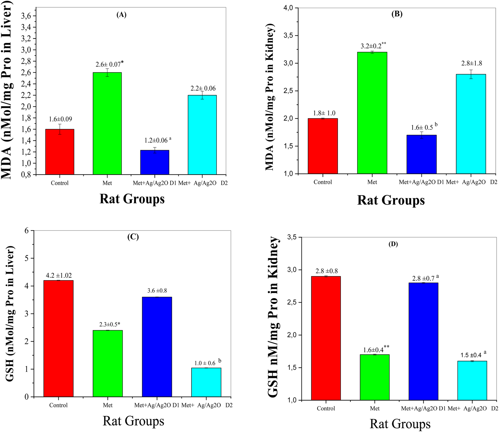 In the next step, the effect of Ag/Ag2O NPs on metribuzin-induced liver and kidney toxicity was assessed in adult Wistar albino rats. To achieve this, the rats were divided into four groups (n = 5/group): Group I served as the control and received normal water; Group II was exposed to metribuzin for 21 days through drinking water to induce liver and kidney toxicity; Group III received Ag/Ag2O NPs via intraperitoneal injection for 21 days to evaluate the effects of the NPs by IP dose 0.0625 mg/kg b.w and Group IV was first exposed to metribuzin followed by intraperitoneal injection of Ag/Ag2O NPs used dose 0.125 mg/kg b.w for 21 days to assess the potential therapeutic effects of the NPs in mitigating metribuzin.