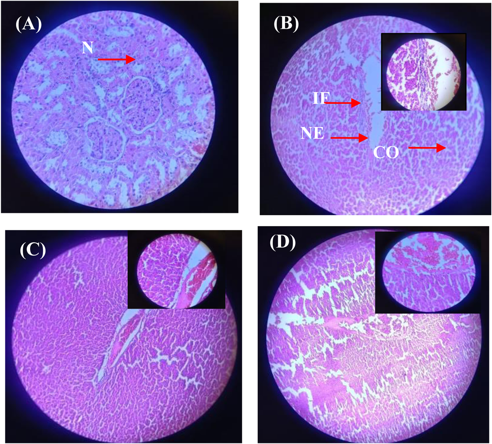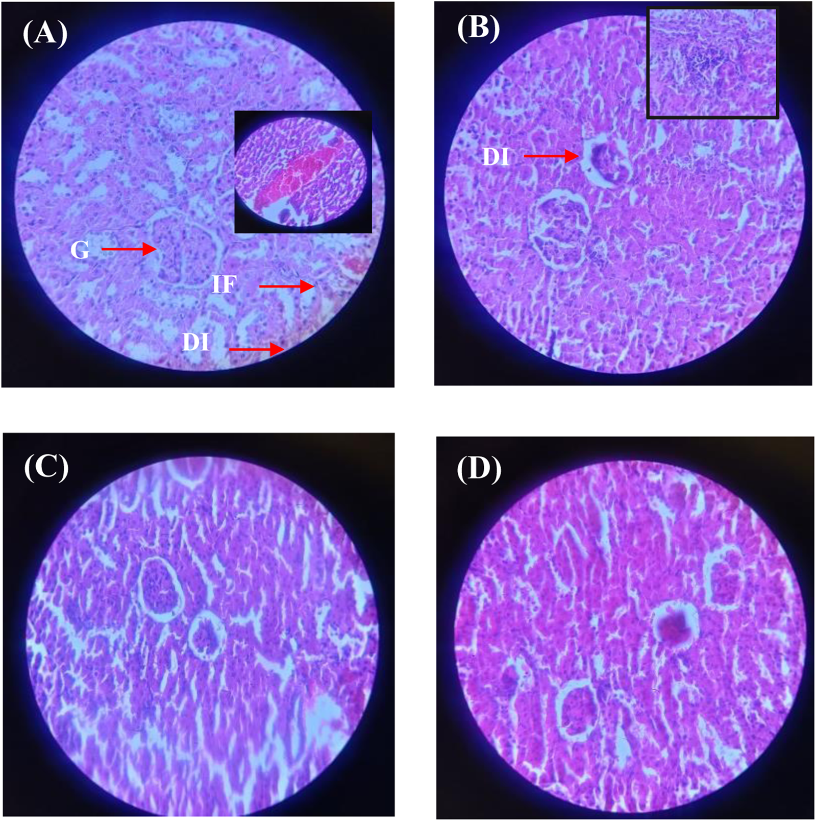After euthanizing the rats, liver and kidney sections were collected and preserved in 10% formaldehyde until preparation for examination. The samples were washed with xylene, embedded in paraffin, and dehydrated through a graded series of ethanol (60%, 70%, 80%, and 100%). Using a Thermo Scientific (Micron HM 325) Histoline Rotary Microtome, paraffin blocks were sectioned into 4–6 µm slices, which were then stained with hematoxylin and eosin to enhance cellular details. Histopathological inspection was performed using a light microscope to evaluate tissue morphology.