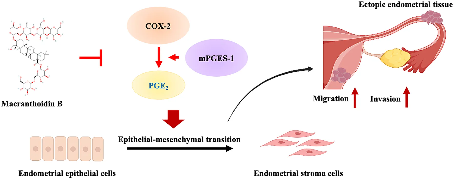 In this study, macranthoidin B significantly reduced the formation and ameliorated the pathological structure of ectopic endometrium. Moreover, macranthoidin B also decreased E2 and raised PROG levels. In addition, macranthoidin B hindered invasion and metastasis of endometrial cells. This was attributed to the blockade of epithelial-mesenchymal transition via COX-2/PGE2 pathway.