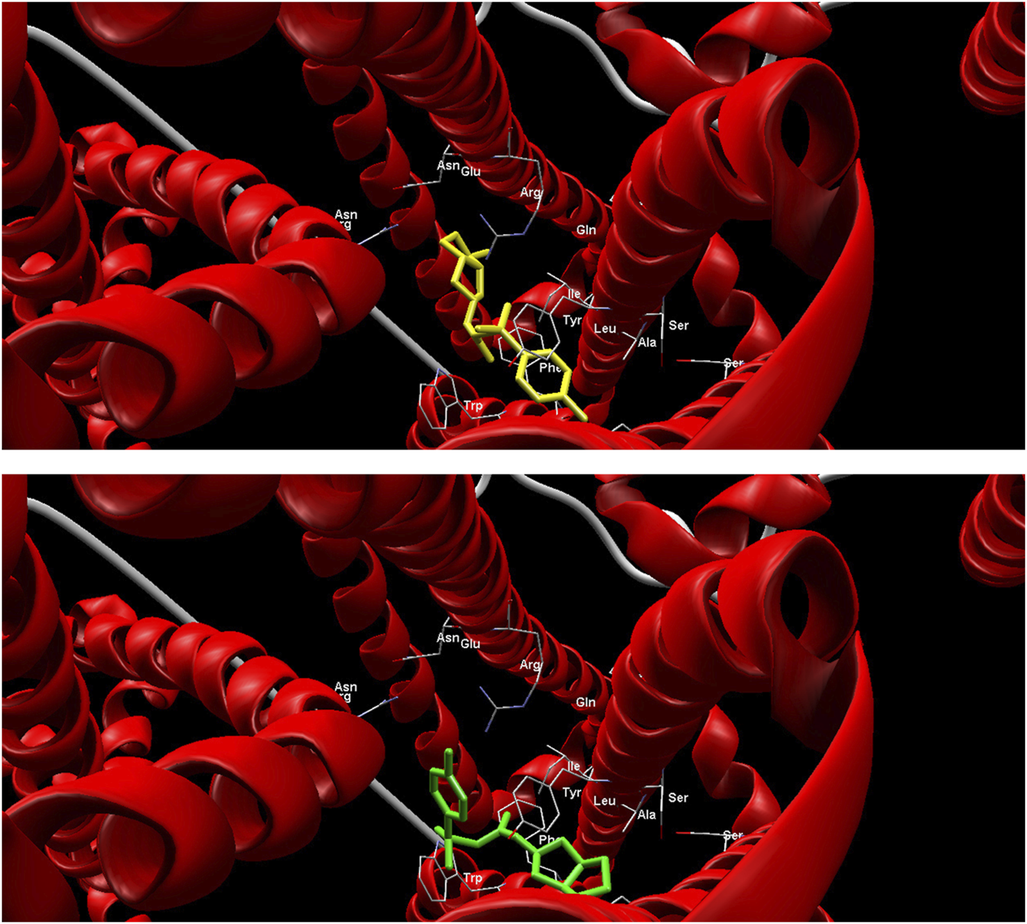 Gliclazide and its metabolites in mol2 format, and the SUR1 receptor in pdb format, were imported into the MVD software. All solvent molecules were removed from the protein structure. The validation of the docking protocol was conducted by “redocking” the co-crystalized ligand (glibenclamide) in the structure of SUR1. The root mean square distance (RMSD) value of the docked glibenclamide was lower than 2 Å, confirming that docked and preexisting co-crystallized glibenclamide were able to interact with the SUR1 active site in a similar manner.