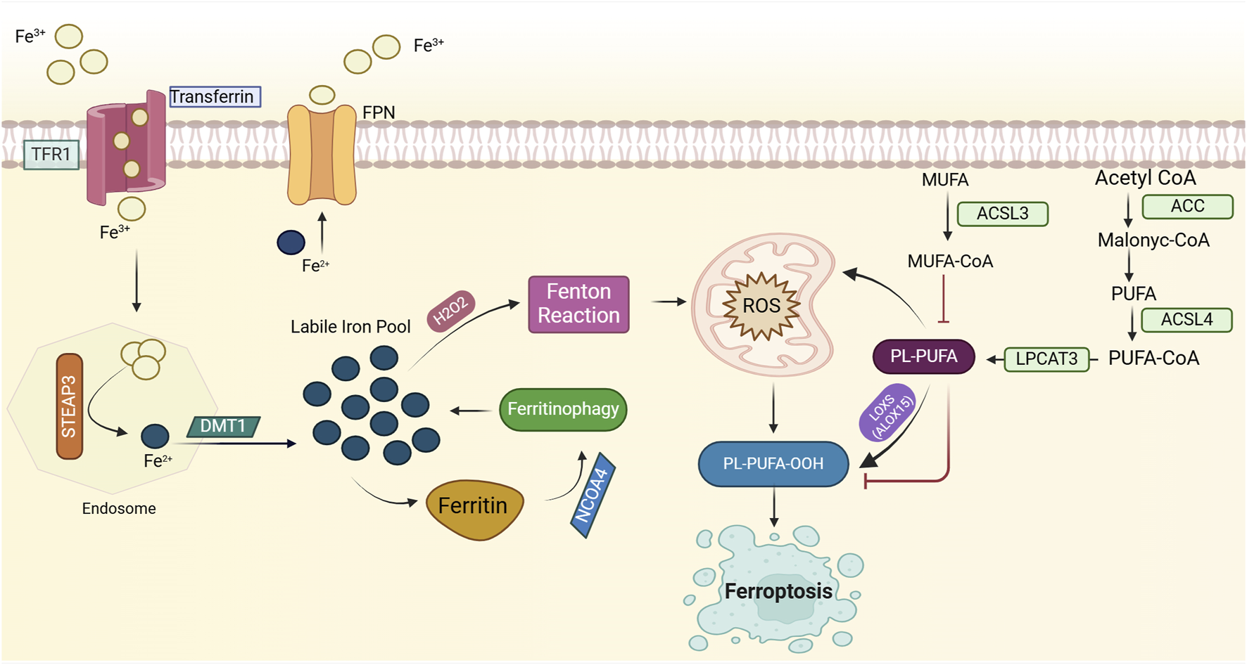 Mechanisms of ferroptosis induction. Ferroptosis is an iron-dependent form of cell death characterized by lipid peroxidation. Elevated intracellular iron, imported via transferrin (TF) and transferrin receptor 1 (TFR1), is reduced to its ferrous form (Fe2⁺) by STEAP3, and subsequently transported to the labile iron pool by DMT1. This labile iron contributes to the generation of reactive oxygen species (ROS), particularly hydroxyl radicals (⋅OH), through the Fenton reaction, where Fe2⁺ catalyzes the conversion of hydrogen peroxide (H₂O₂) into highly reactive ROS. ROS, in turn, initiate oxidative damage, including the peroxidation of polyunsaturated fatty acid phospholipids (PUFA-PLs), which serve as key substrates for ferroptosis. Enzymes such as acetyl-CoA carboxylase (ACC), long-chain acyl-CoA synthetase 4 (ACSL4), and lysophosphatidylcholine acyltransferase 3 (LPCAT3) facilitate the incorporation of PUFAs into phospholipids, thereby promoting lipid peroxidation. Ferroptosis is further exacerbated by ferritinophagy, a process that releases iron from ferritin stores, thereby increasing ROS production through NCOA4-mediated ferritin degradation. Lipid peroxidation is driven by iron-dependent lipoxygenases, producing toxic phospholipid hydroperoxides (PUFA-PL-OOH). Cellular sensitivity to ferroptosis is regulated by the dynamic balance of iron import/export (e.g., TFR1, ferroportin (FPN)), iron storage (e.g., ferritin), and lipid metabolism. Please see the text for specific details. Fe3+, ferric ion; Fe2+, ferrous ion; TFR1, transferrin receptor 1; FPN, ferroportin; STEAP3, six transmembrane epithelial antigen of prostate 3; H2O2, hydrogen peroxide; ROS, reactive oxygen species; PL-PUFA-OOH, phospholipid polyunsaturated fatty acid hydroperoxide, NCOA4, Nuclear Receptor Coactivator 4; ROS, Reactive Oxygen Species; MUFA, Monounsaturated Fatty Acids; ACSL3, Acyl-CoA Synthetase Long-Chain Family Member 3; MUFA-CoA, Monounsaturated Fatty Acid Coenzyme A; PL-PUFA, Phospholipid Polyunsaturated Fatty Acids; LOXS, Lipoxygenases; PL-PUFA-OOH, Phospholipid Polyunsaturated Fatty Acid Hydroperoxide; LPCAT3, Lysophosphatidylcholine Acyltransferase 3; PUFA, Polyunsaturated Fatty Acids; ACSL4, Acyl-CoA Synthetase Long-Chain Family Member 4; ACC, Acetyl-CoA Carboxylase.