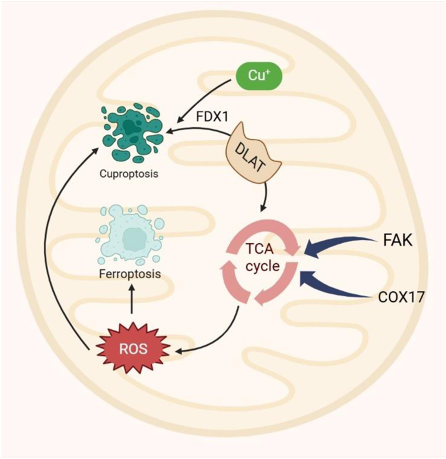 Mitochondria play a central role in ferroptosis by serving as major sources of intracellular ROS. Similarly, cuproptosis occurs in mitochondria, with the TCA cycle acting as a shared pathway for both processes. Dihydrolipoamide S-acetyltransferase (DLAT), a key TCA cycle component, is lipoylated by FDX1, and its interaction with copper triggers cuproptosis. This underscores the mitochondrial TCA cycle as a convergence point for ferroptosis and cuproptosis. Additionally, COX7A1 and FAK accelerate the TCA cycle, promoting the production of metabolites that drive ferroptosis and cuproptosis. ROS, reactive oxygen species; COX7A1, cytochrome c oxidase 7A1; FAK; focal adhesion kinase. FDX1, ferredoxin 1.