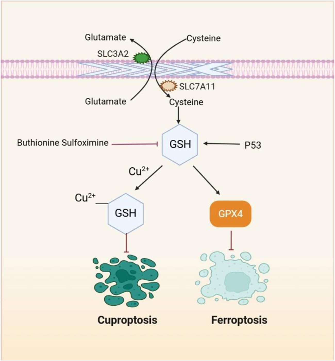 GSH plays a pivotal role in both ferroptosis and cuproptosis, serving distinct functions in each pathway (Badgley et al., 2020; Tsvetkov et al., 2022). In ferroptosis, it acts as an antioxidant, inhibiting lipid peroxidation (LPO), while in cuproptosis, it functions as a copper chaperone, binding copper to mitigate the aggregation of lipoylated proteins (Badgley et al., 2020; Tsvetkov et al., 2022). Interestingly, GSH has been shown to have inhibitory effects on both ferroptosis and cuproptosis, suggesting a converging point (Liu and Chen, 2024).